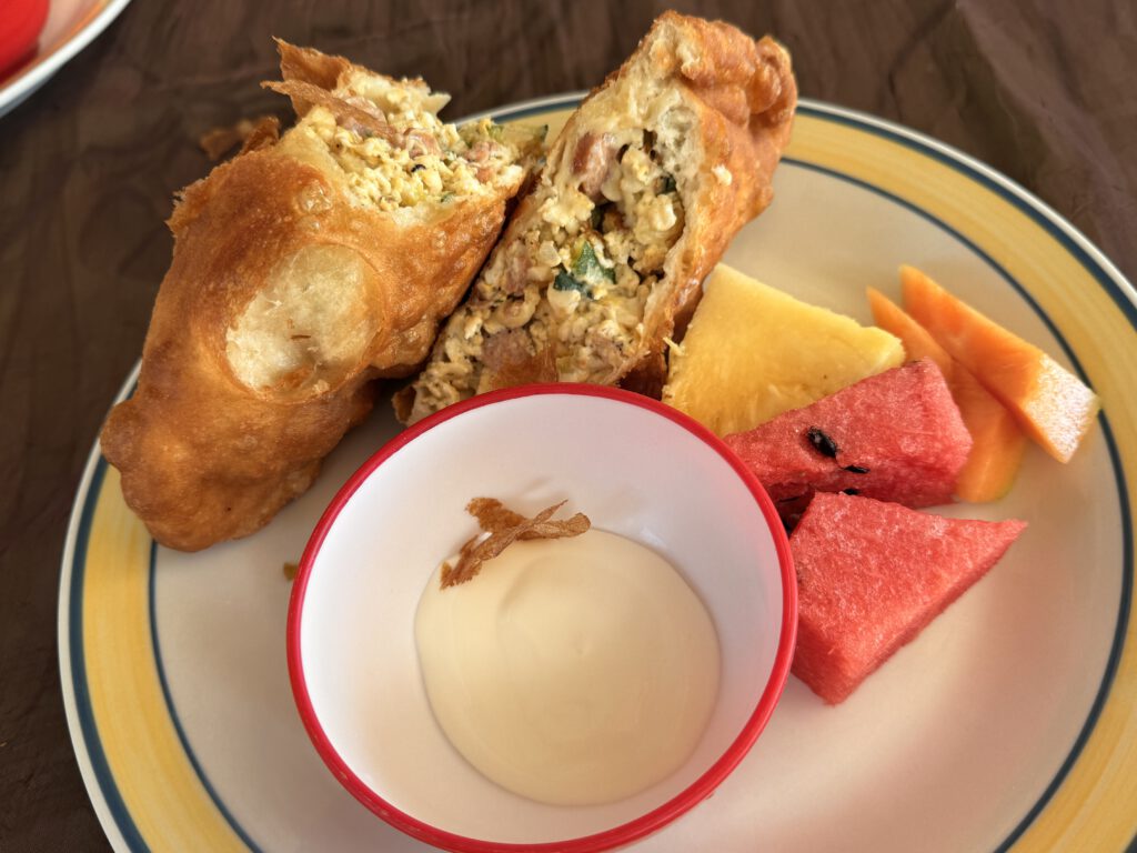Um nicht lange suchen zu müssen, begeben wir uns zum „H2V Beachfront Restaurant and Bar“, in dem wir gestern zu Abend gegessen hatten. Die Bedienung ist gerade dabei, die Tischdecken windfest auf den Tischen zu befestigen (mit Hilfe von Reißnägeln!) und Wolfgang unterstützt sie ein wenig, während wir auf unsere Rühreivariationen (als Burrito und als Fried Jack) warten. Abgesehen vom Instant-Kaffee genießen wir ein wirklich leckeres Frühstück mit frischem Obst als Beilage.