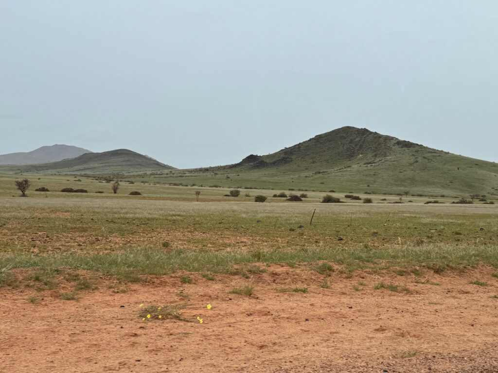 Regen in der Wüste. Eine Mischung aus zartem und sattem Grün, wo eigentlich nur Sand sein dürfte.