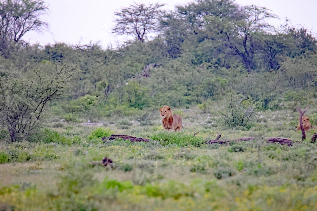 Pirschfahrten rund um Namutoni mit tollen Landschaftseindrücken und einer Sichtung von 3 männlichen Löwen.