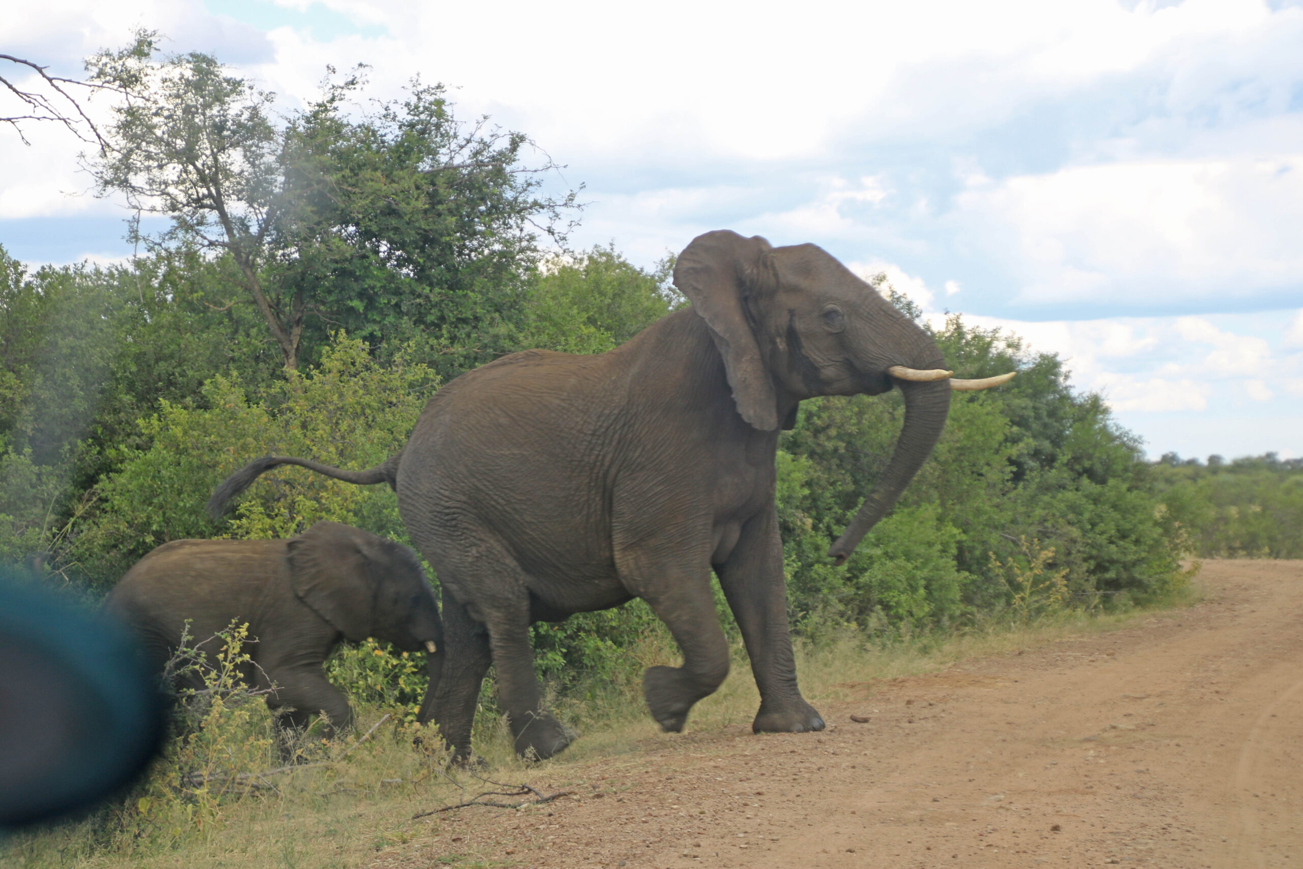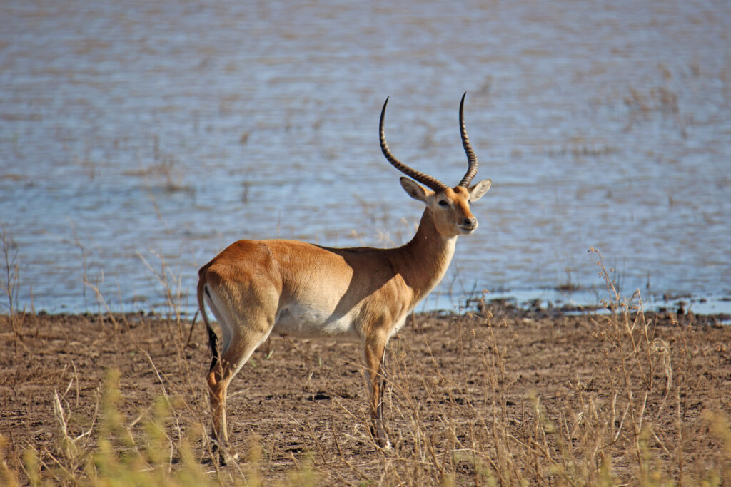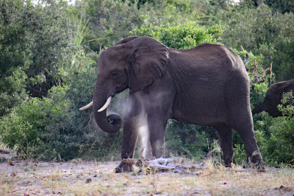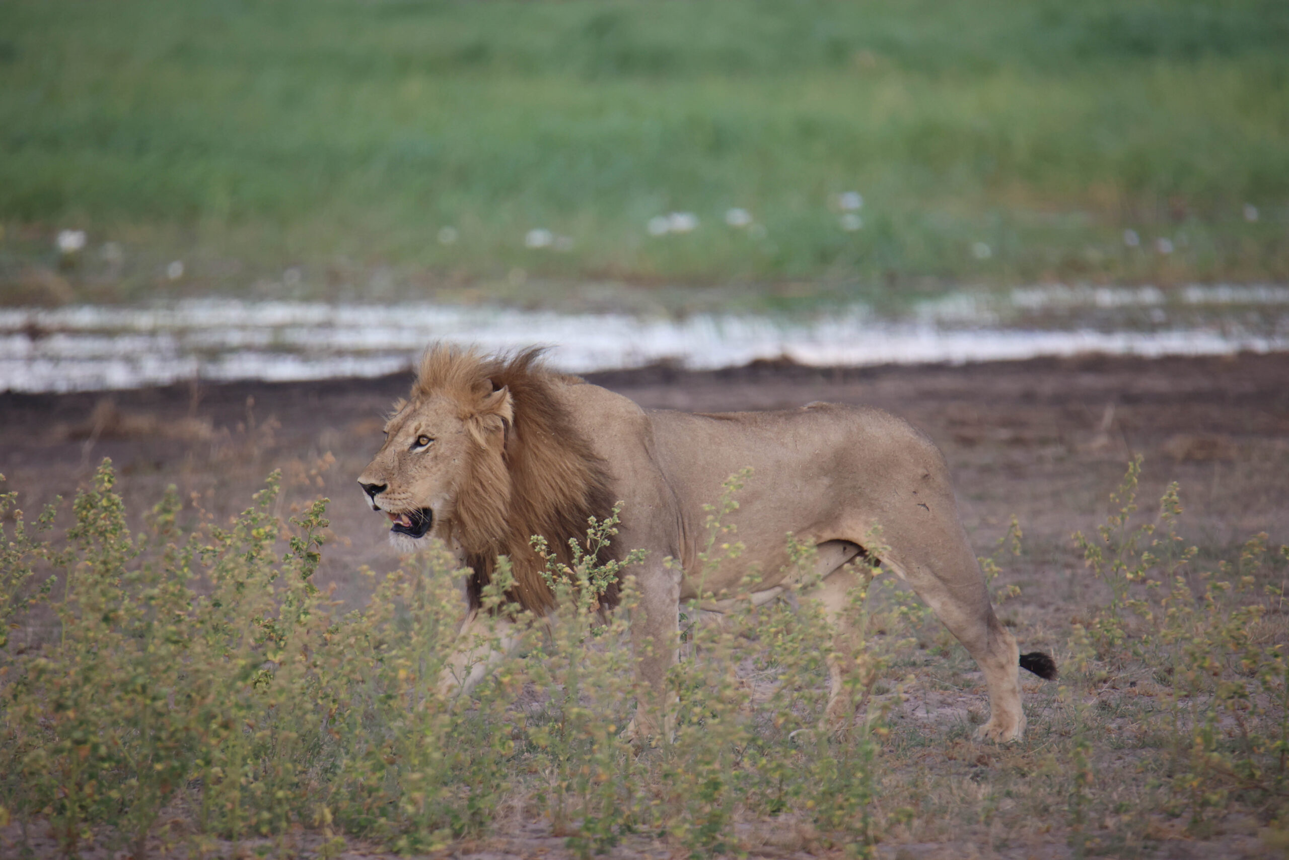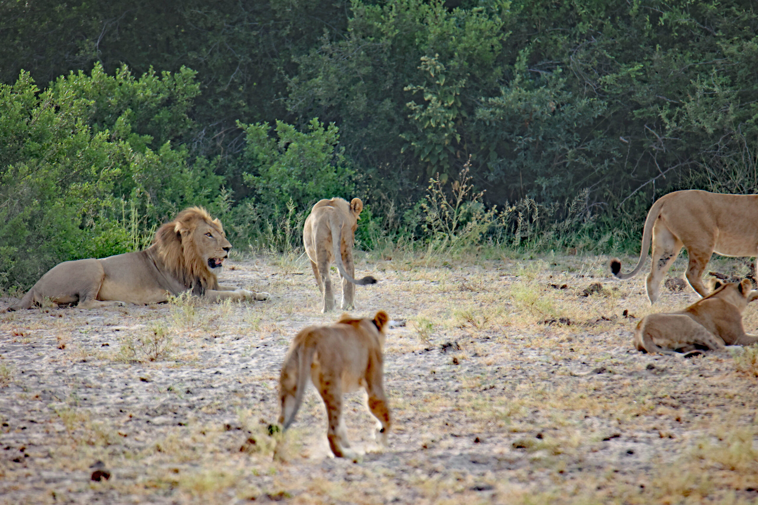 Nach einer vormittäglichen Pirschfahrt ohne besondere Sichtungen erleben wir auf der Nachmittags-Runde durch den Manhango Park eine außerordentlich schöne und lange Sichtung von Löwen und Elefanten gleichzeitig. Einzigartig, eine „Löwen-Familie“ (Löwe, Löwin und 3 Jugendliche) so lange „in action“ erleben zu können. Sogar einen Versuch, Letschwe Antilopen zu jagen, können wir beobachten.