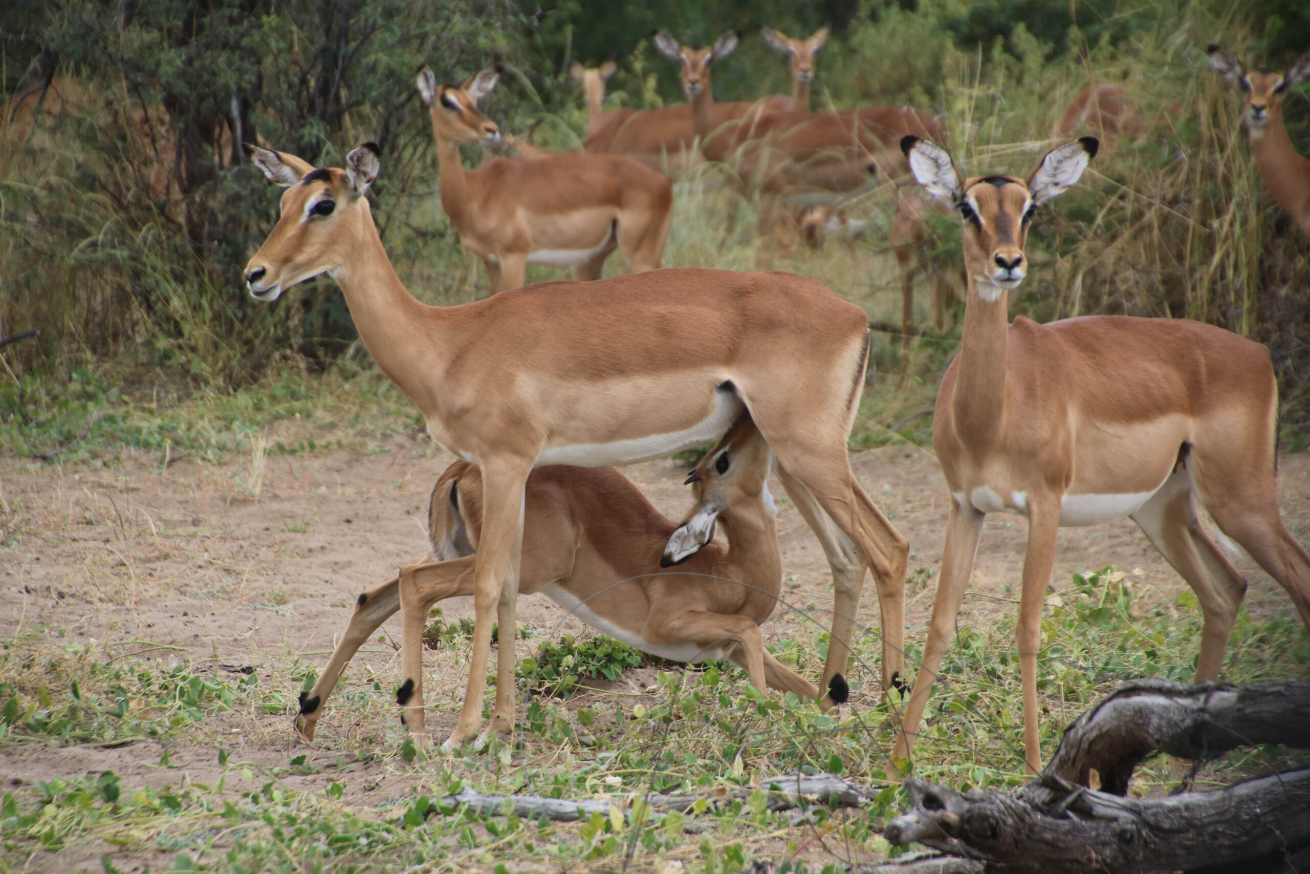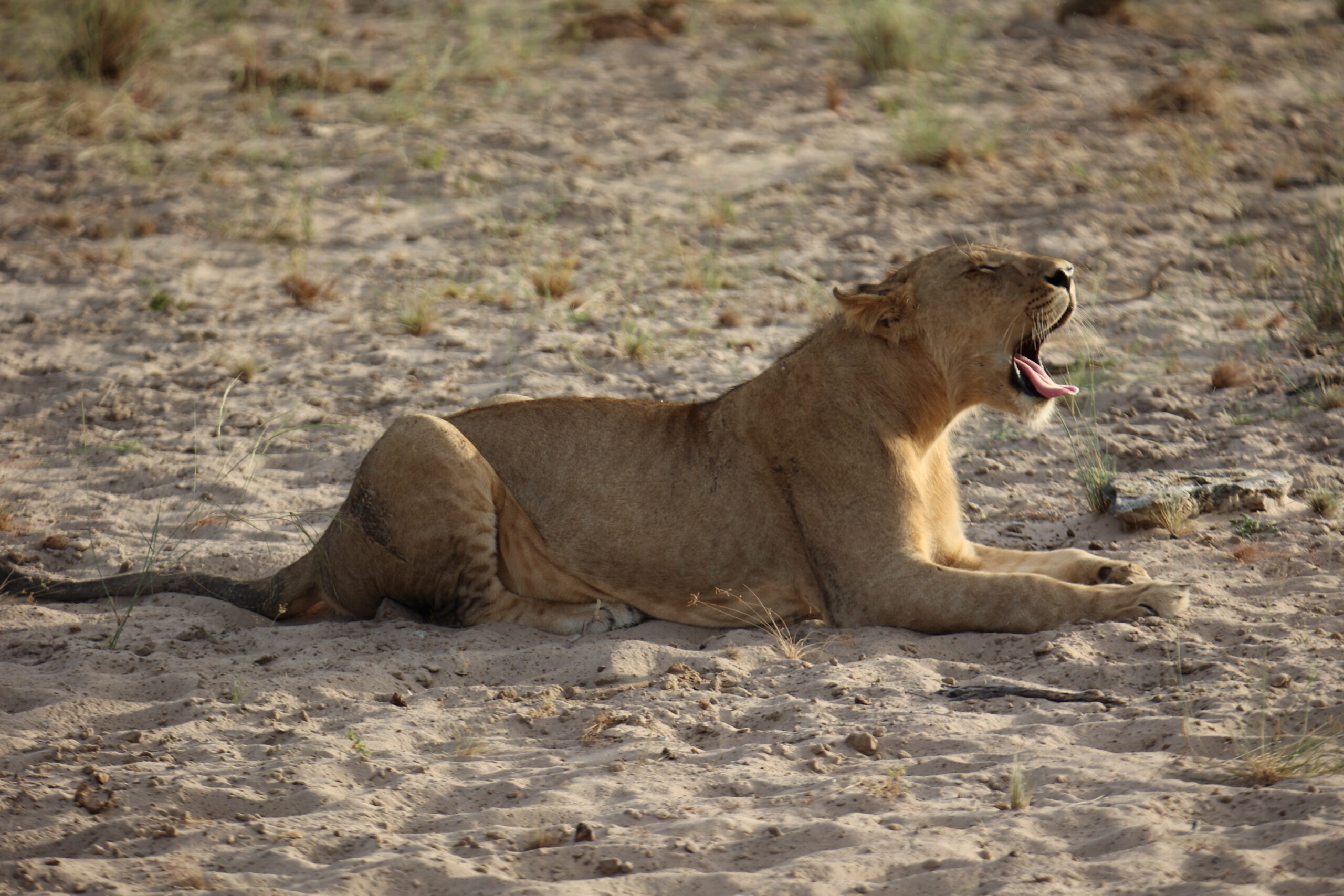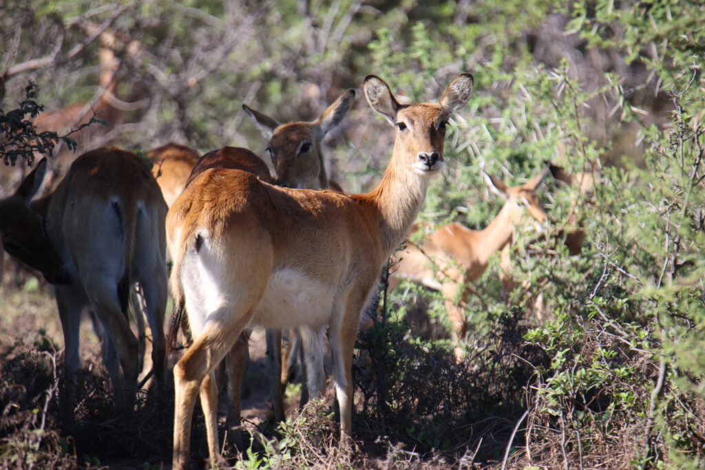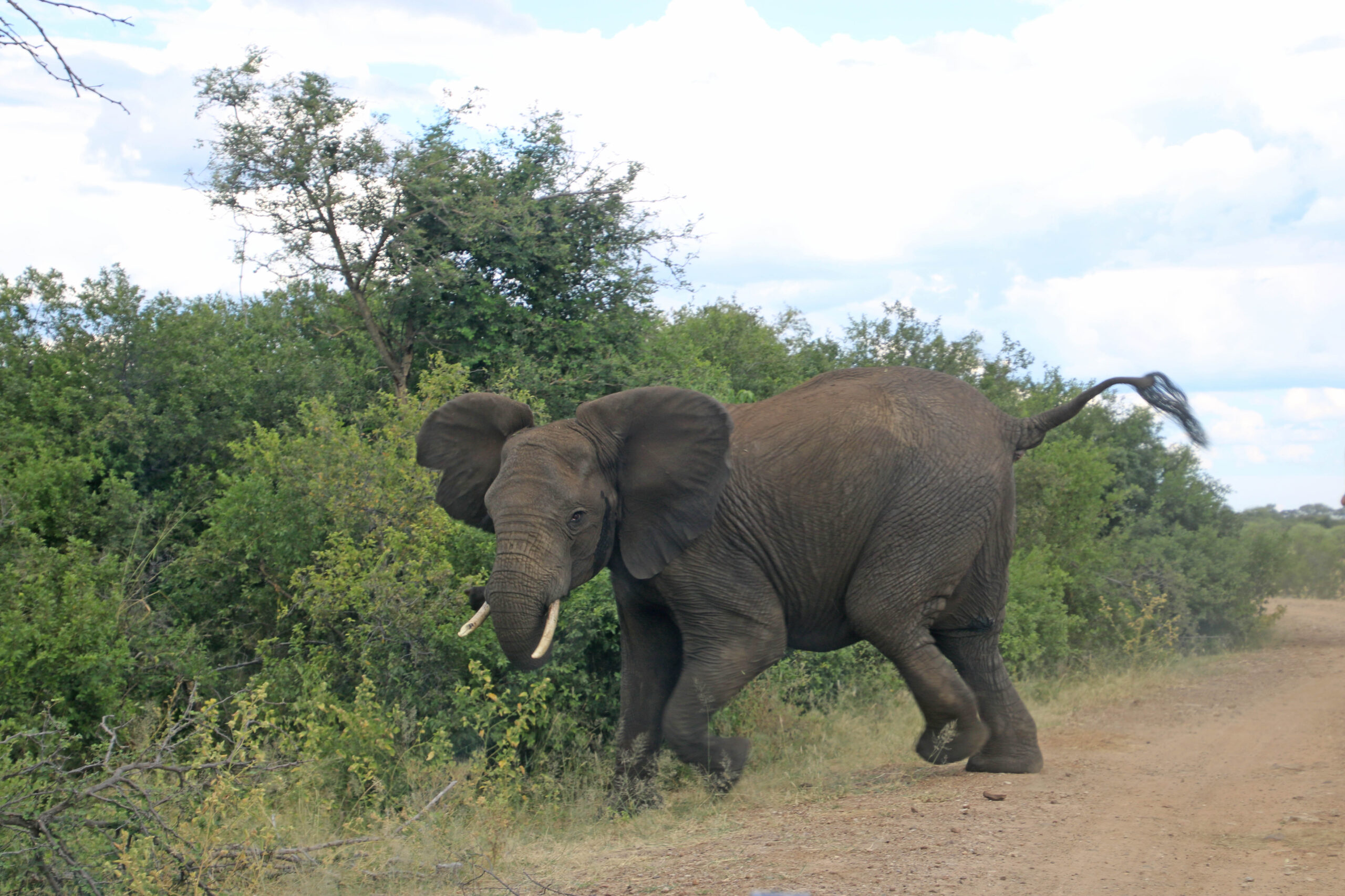 Nach einer vormittäglichen Pirschfahrt ohne besondere Sichtungen erleben wir auf der Nachmittags-Runde durch den Manhango Park eine außerordentlich schöne und lange Sichtung von Löwen und Elefanten gleichzeitig. Einzigartig, eine „Löwen-Familie“ (Löwe, Löwin und 3 Jugendliche) so lange „in action“ erleben zu können. Sogar einen Versuch, Letschwe Antilopen zu jagen, können wir beobachten.