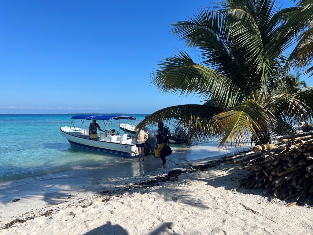 Die etwa 40-minütige Bootsfahrt zur Insel ist recht holprig. Am Strand angekommen, werden wir abgesetzt, erhalten eine Sicherheitsbelehrung – und dann geht es für unsere zwölfköpfige Gruppe, begleitet von zwei Guides, ins Wasser.