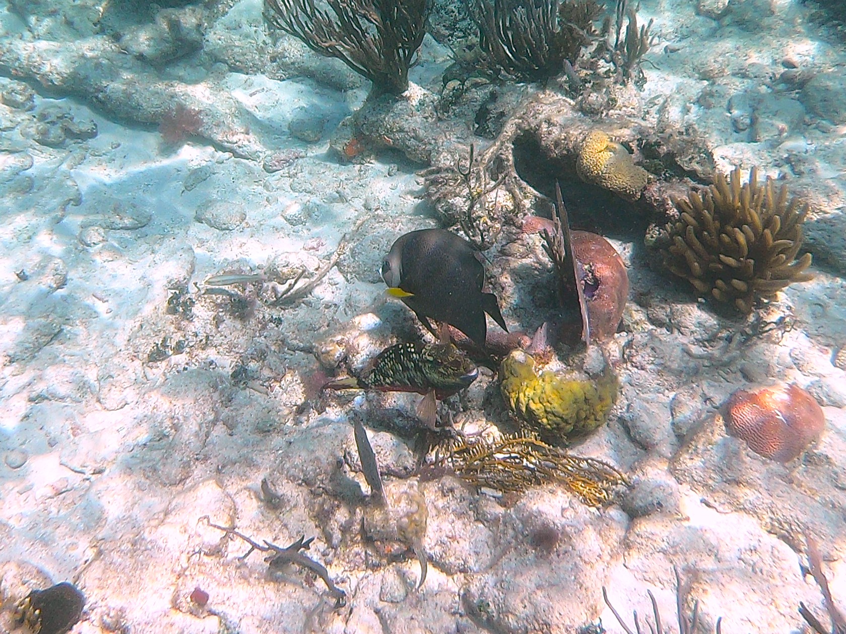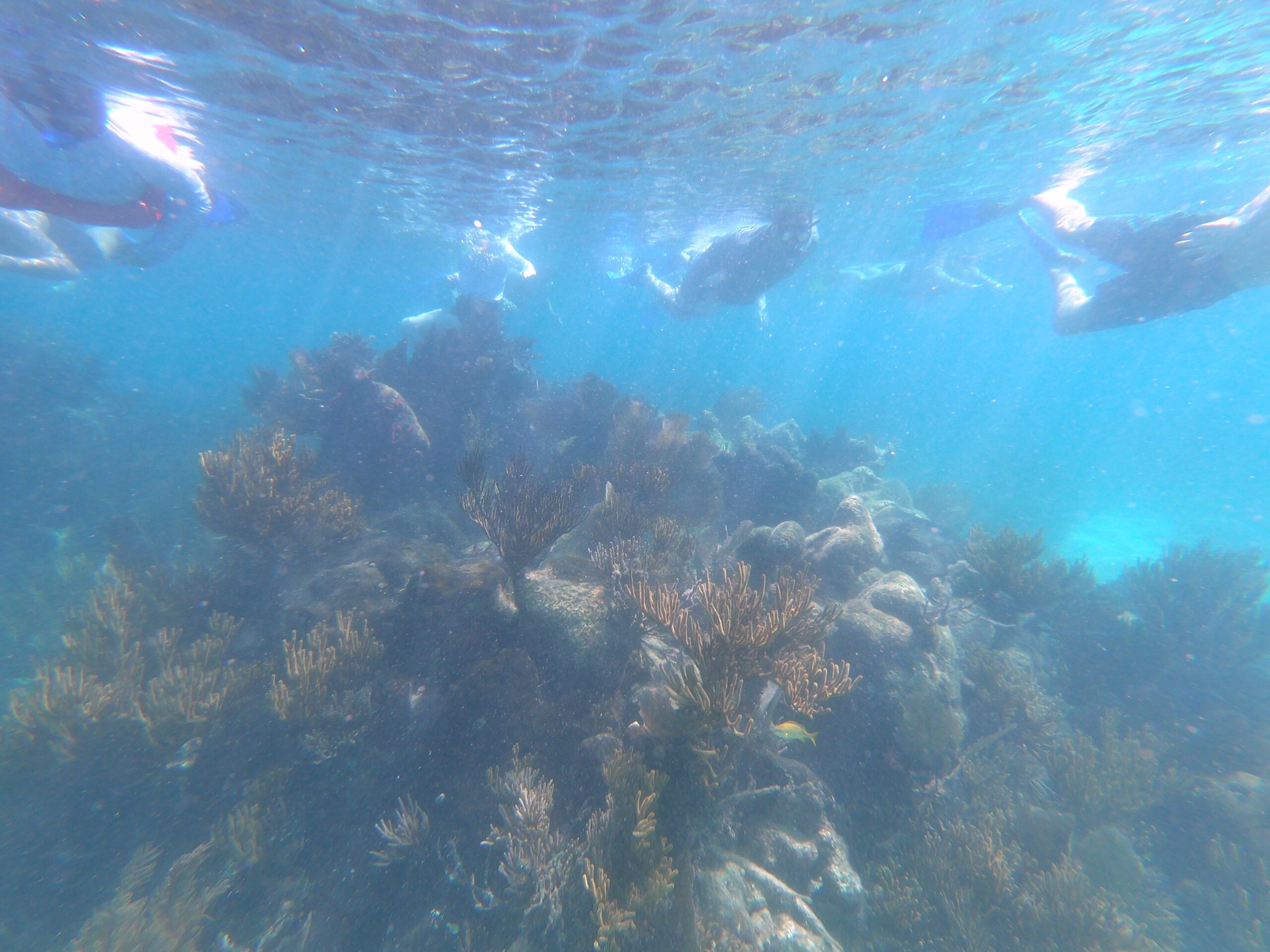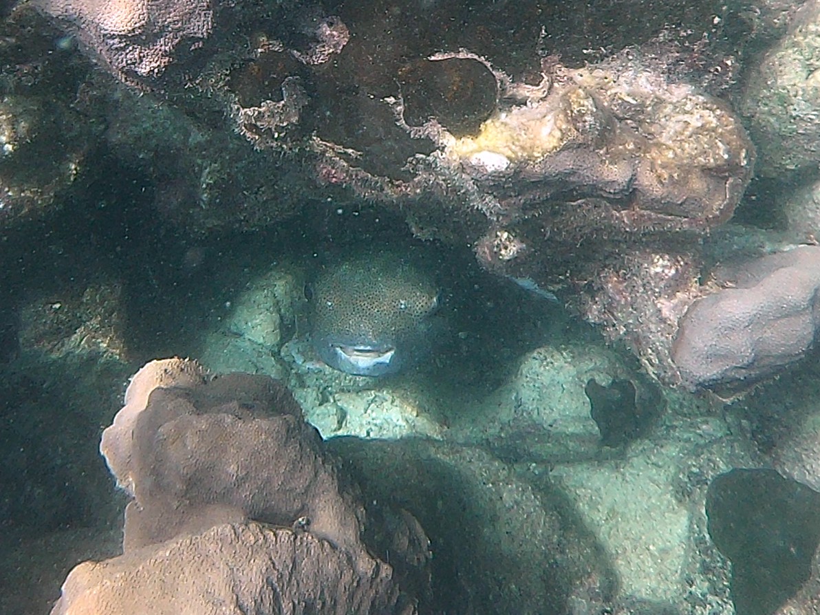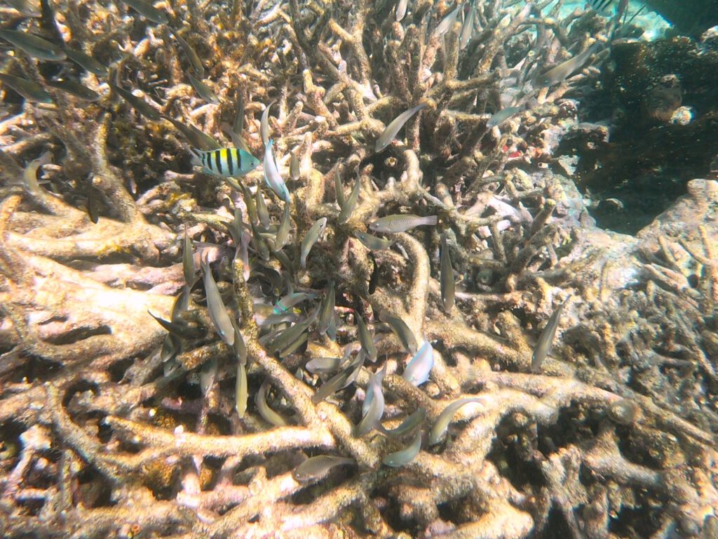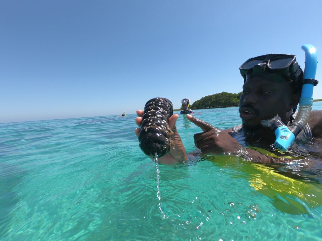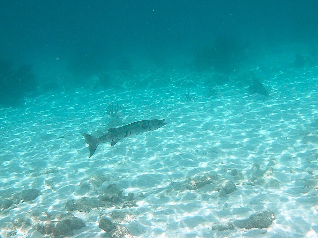 Zunächst einmal begeistern uns die vielen verschiedenartigen Korallen, die große Teile des Meeresbodens besiedeln. Nach und nach erspähen wir kleine Fische in den unterschiedlichsten Formen und Farben. Es sind zwar keine Fischschwärme zu sehen, aber viele verschiedene Arten von Fischen. Einmal lässt sich eine Gruppe von 10 bis 20 Barrakudas in einiger Entfernung ausmachen und auch einen Riffhai können wir kurz sehen, bevor er sich in tieferes Wasser verzieht. Einmal holt unser Guide eine Languste vom Meeresboden herauf, später eine Seegurke, Tiere, die wir bisher noch nicht lebend gesehen haben, sondern allenfalls auf dem Teller. Wir können es kaum glauben, dass die Tour schon wieder zu Ende ist. Die gute Stunde im Wasser ist so schnell vergangen!