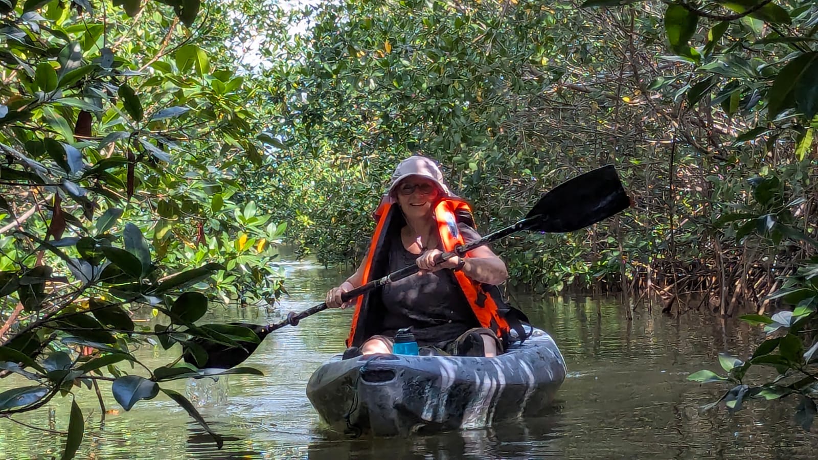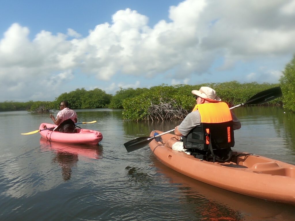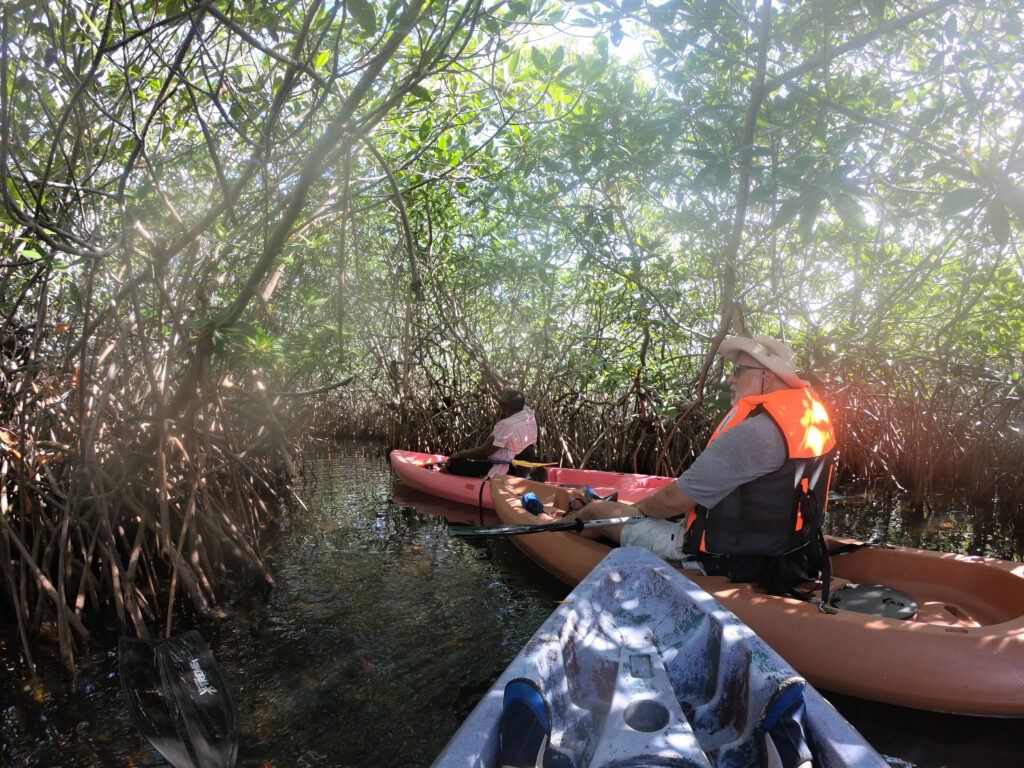 Jeder von uns steigt in sein eigenes Kanu, und schon bald gleiten wir – begleitet vom gleichmäßigen Plätschern der Paddel – hinter Uwahnie her durchs Wasser. Langsam entfernen wir uns von der Einsetzstelle und tauchen in die ruhige, grüne Welt der Mangroven ein.