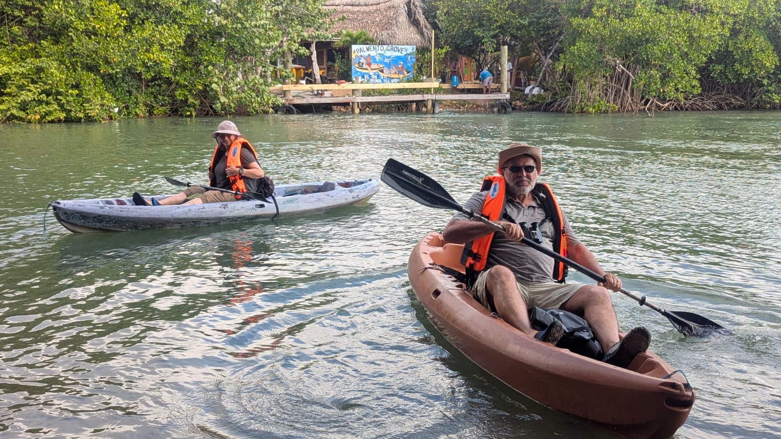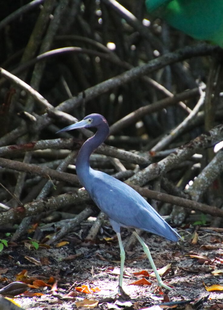 Die Lagune am nördlichen Stadtrand von Hopkins ist zwar kein ausgewiesenes Schutzgebiet, wirkt aber dennoch wie ein erstaunlich intaktes kleines Ökosystem. Gesäumt von verschiedenen Mangrovenarten bildet sie einen wichtigen Lebensraum für Fische, Vögel und zahlreiche andere Tiere. Durch wechselnde Wasserstände, Sedimente und das stetige Wachstum der Mangroven verändert sich ihr Erscheinungsbild immer wieder – so erklärt es uns unsere Guide Uwahnie an diesem Morgen. Mal öffnen sich kleine Wasserflächen, mal wachsen schmale Kanäle zu, während an anderer Stelle neue entstehen.