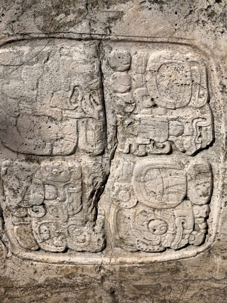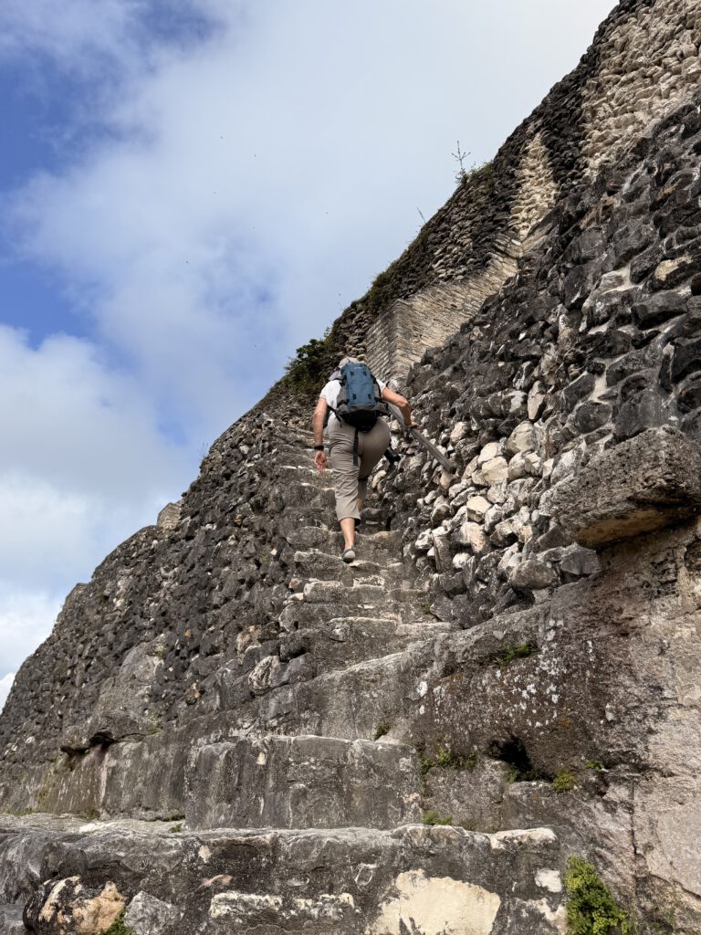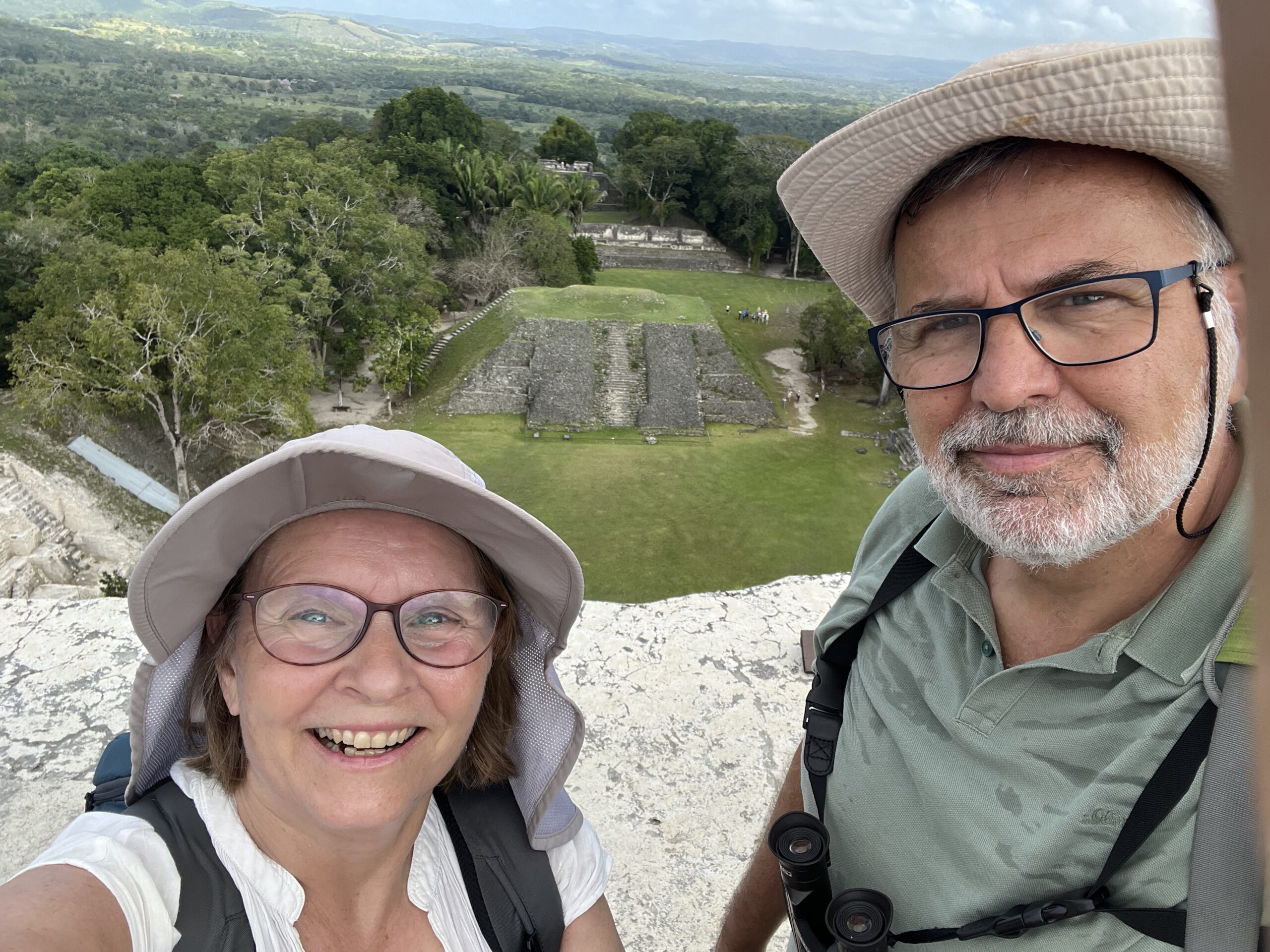 Oben angekommen werden wir für die Anstrengung reichlich belohnt. Von der Plattform der Pyramide reicht der Blick weit über das grüne Blättermeer des Dschungels. und von hier oben soll man sogar bis nach Guatemala hinübersehen können. Für den Moment genießen wir einfach nur die Ruhe, den warmen Wind und das intensive Gefühl, auf einem Bauwerk zu stehen, das schon seit mehr als zwölf Jahrhunderten in dieser Landschaft steht.