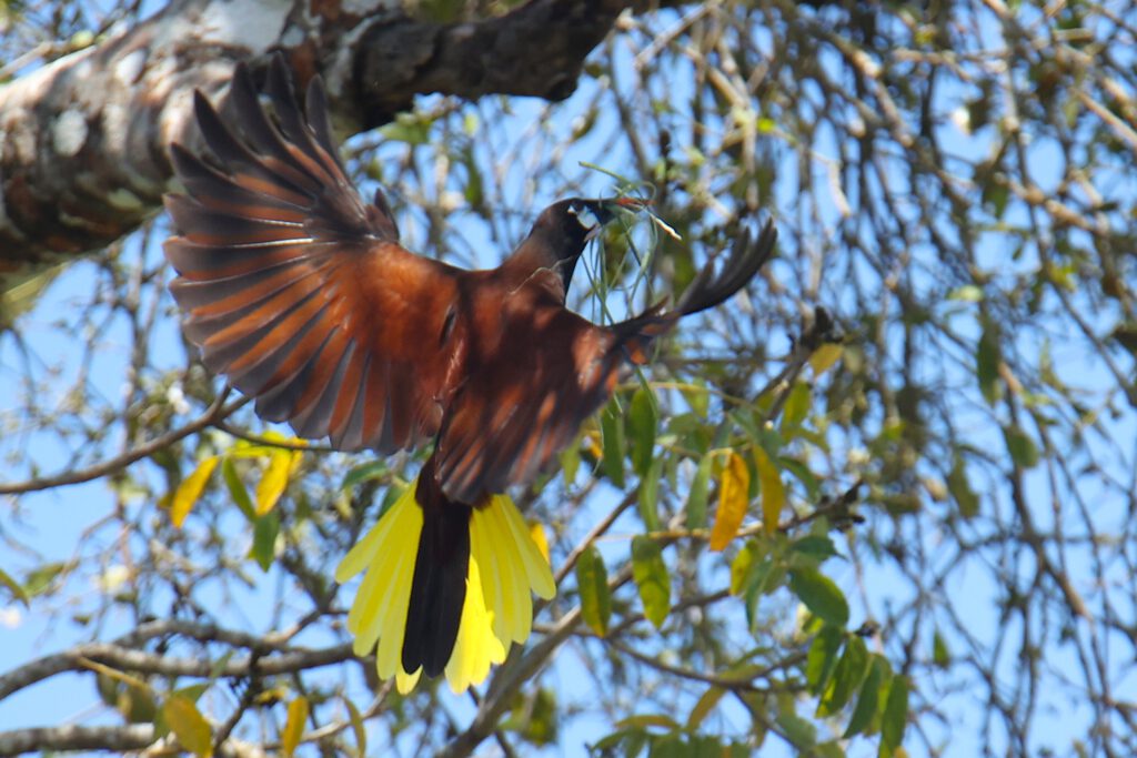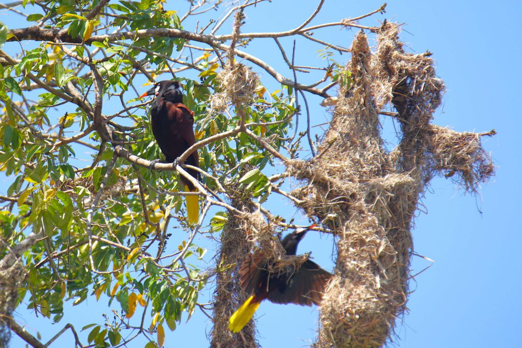 Wir sind insgesamt mehr als drei Stunden in der Anlage unterwegs, wovon wir einige Zeit für eine ausgiebige Sichtung von Montezuma-Stirnvögeln verbringen, die hier ihre auffälligen Nester in einen Baum bauen, der mitten in dem Gebäudekomplex “A Plaza“ steht. Die Hitze und die vielen Stufen strengen uns ganz schön an!