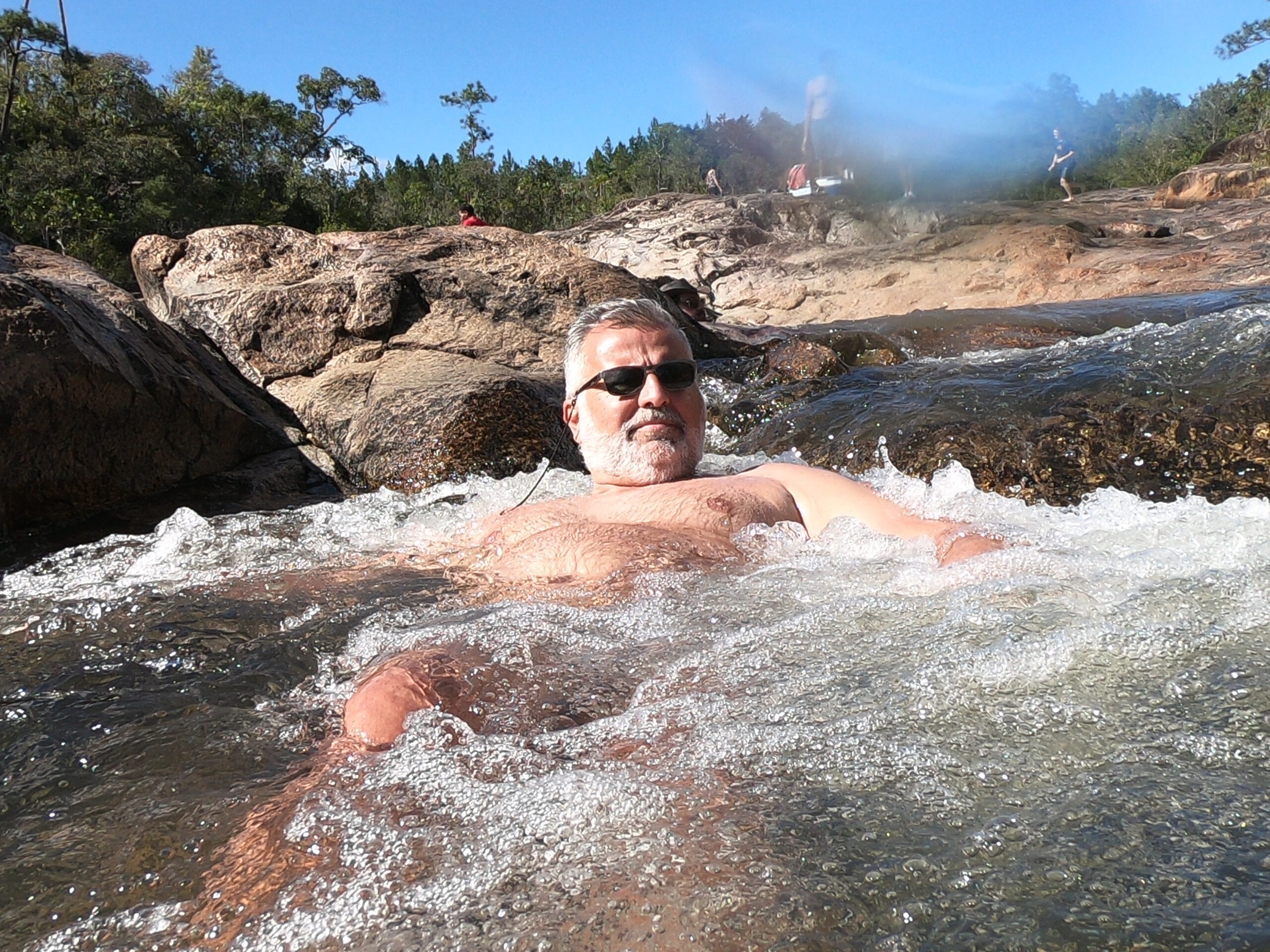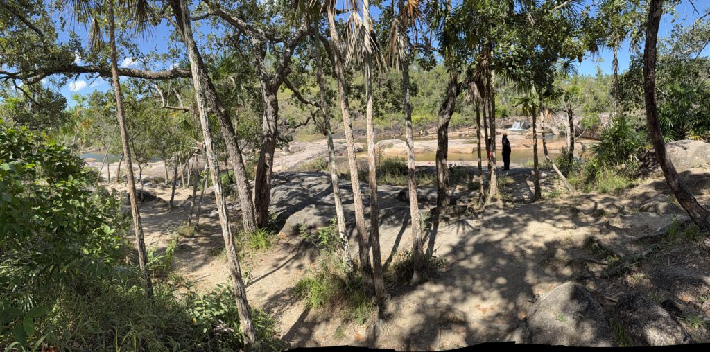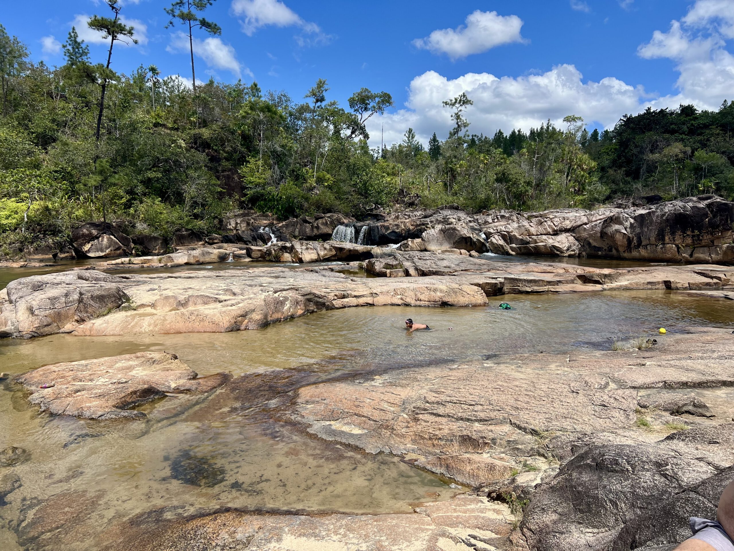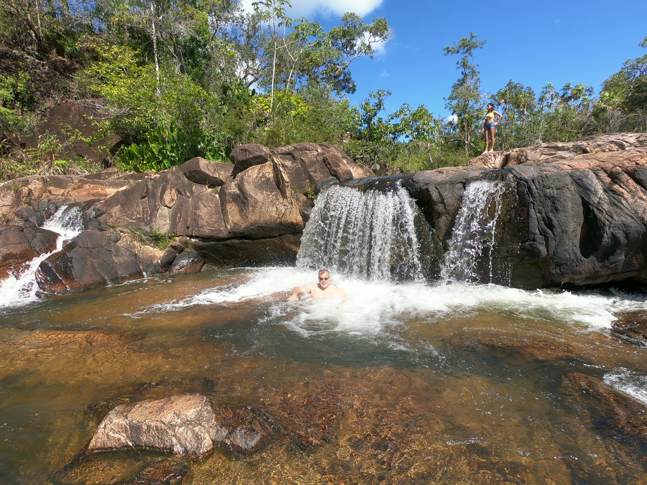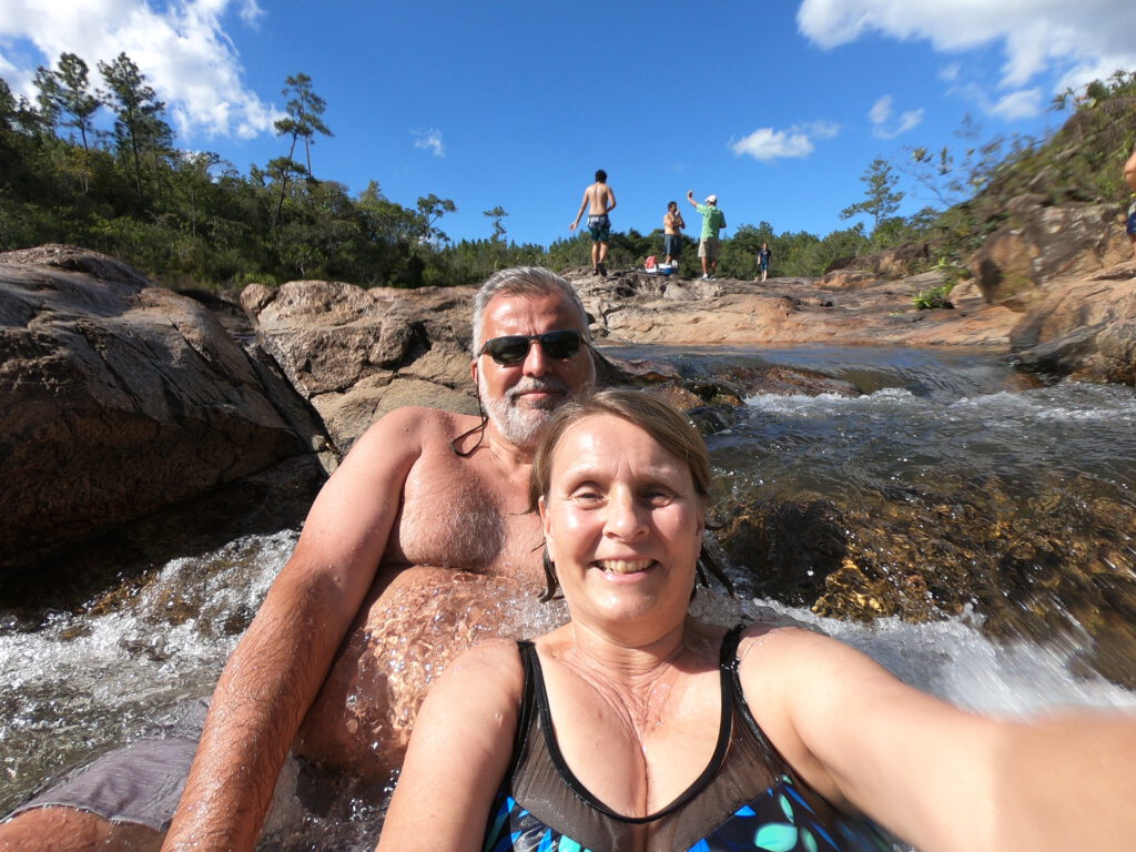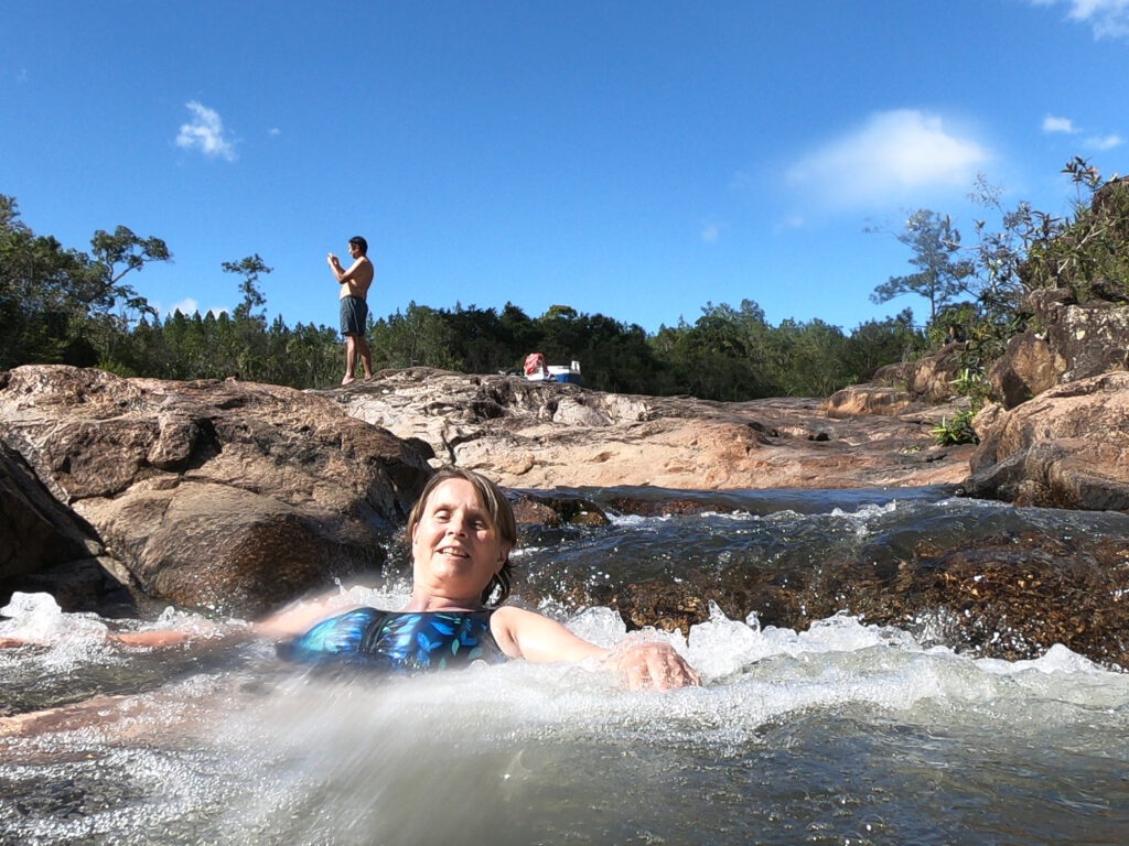 Als wir gegen 10 Uhr dort eintreffen, sind wir doch sehr erleichtert, dass nur vier weitere Autos auf dem Parkplatz stehen. Und entsprechend leer sind die Rock-Pools. Wir suchen uns ein Plätzchen unter einem schattenspendenden Bäumchen und stürzen uns anschließend ins kühle Nass. Wobei… „stürzen“ trifft es nicht ganz: wir suchen uns einen Weg auf glitschigen Steinen und mit der Strömung kämpfend, die an manchen Stellen stärker ist als vermutet. Zunächst gönnen wir uns eine ausgiebige Schultermassage unter einem ca. 1 Meter hohen Wasserfall und lassen uns anschließend von der Strömung von einem Pool zum nächsten treiben. Der Rest des Tage ist schnell erzählt: Lesen, Baden und sich an der malerischen Flusslandschaft erfreuen. Im Laufe des Tages hatten sich zwar noch weitere Badegäste eingefunden, doch kein Vergleich zu gestern.