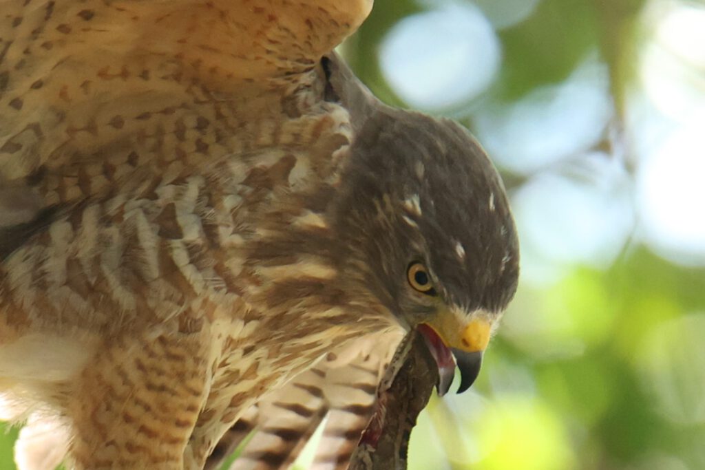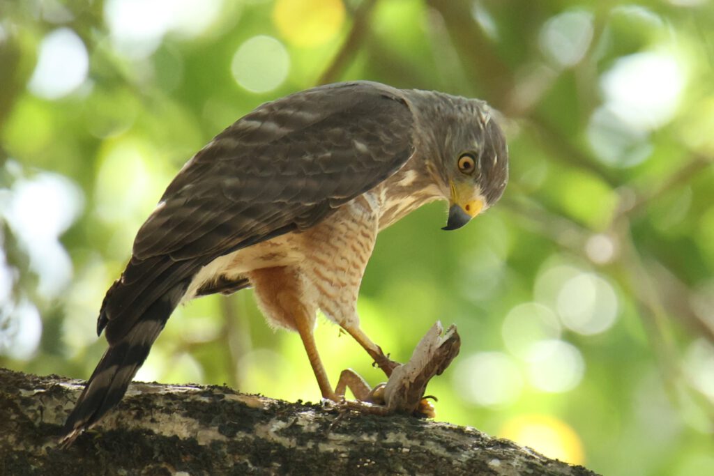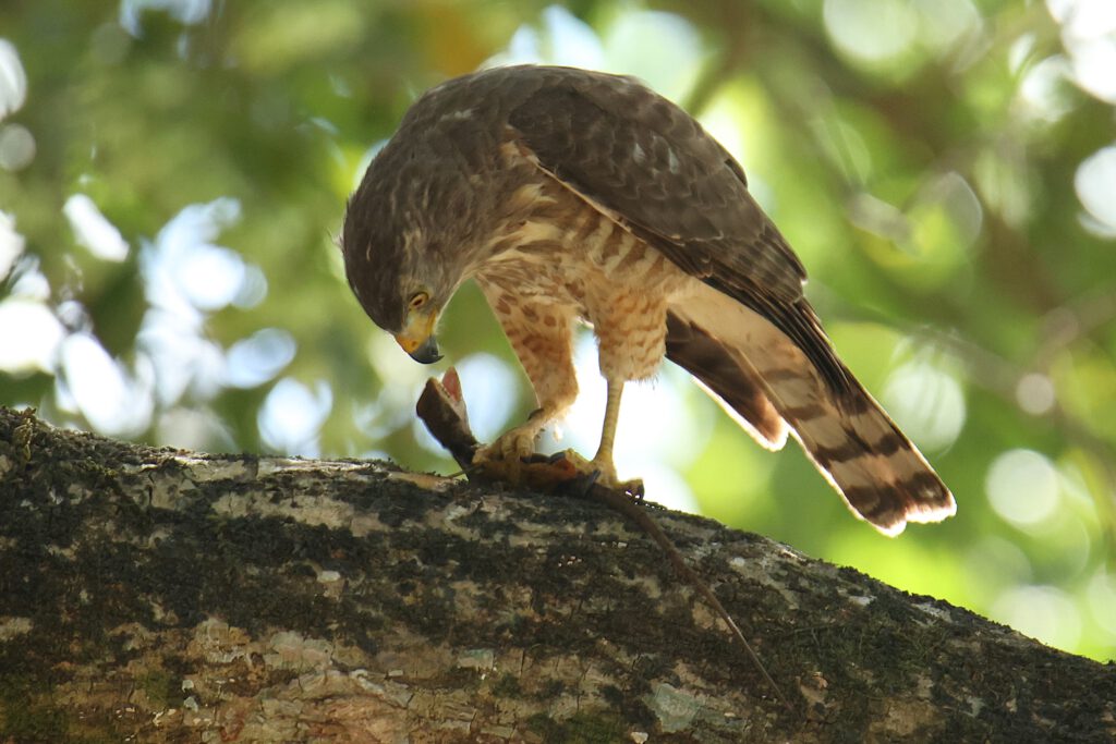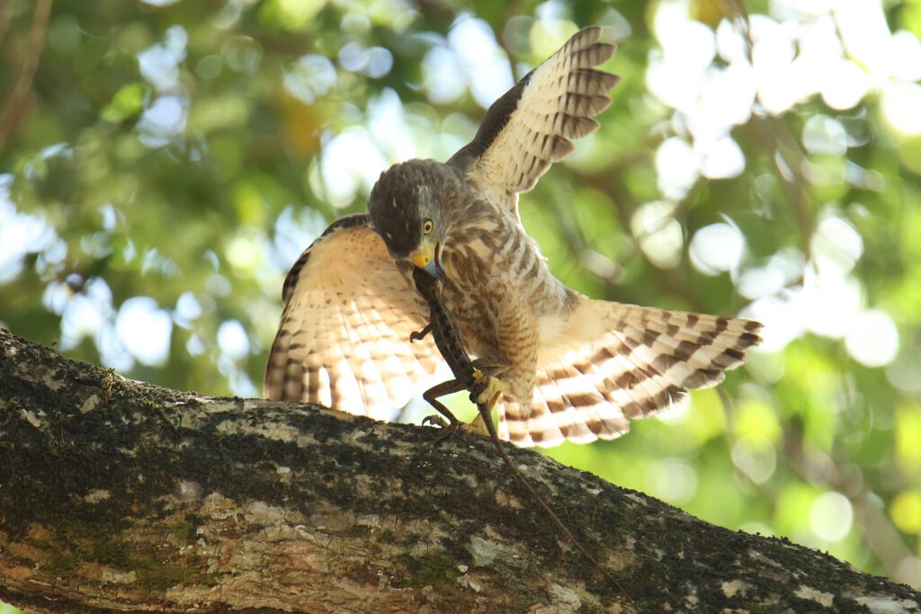 Ein erstes Vogel-Highlight erlebt Andrea schon am Eingangstor der Anlage, während ich noch mit dem Check-in beschäftigt bin. Ein Wegebussard hat eine für seine Verhältnisse riesige Echse erbeutet – und kämpft sichtlich damit, die Beute zu verspeisen. Die Echse setzt sich massiv zur Wehr und schafft es, sich am Kopf des Bussards festzubeißen …
