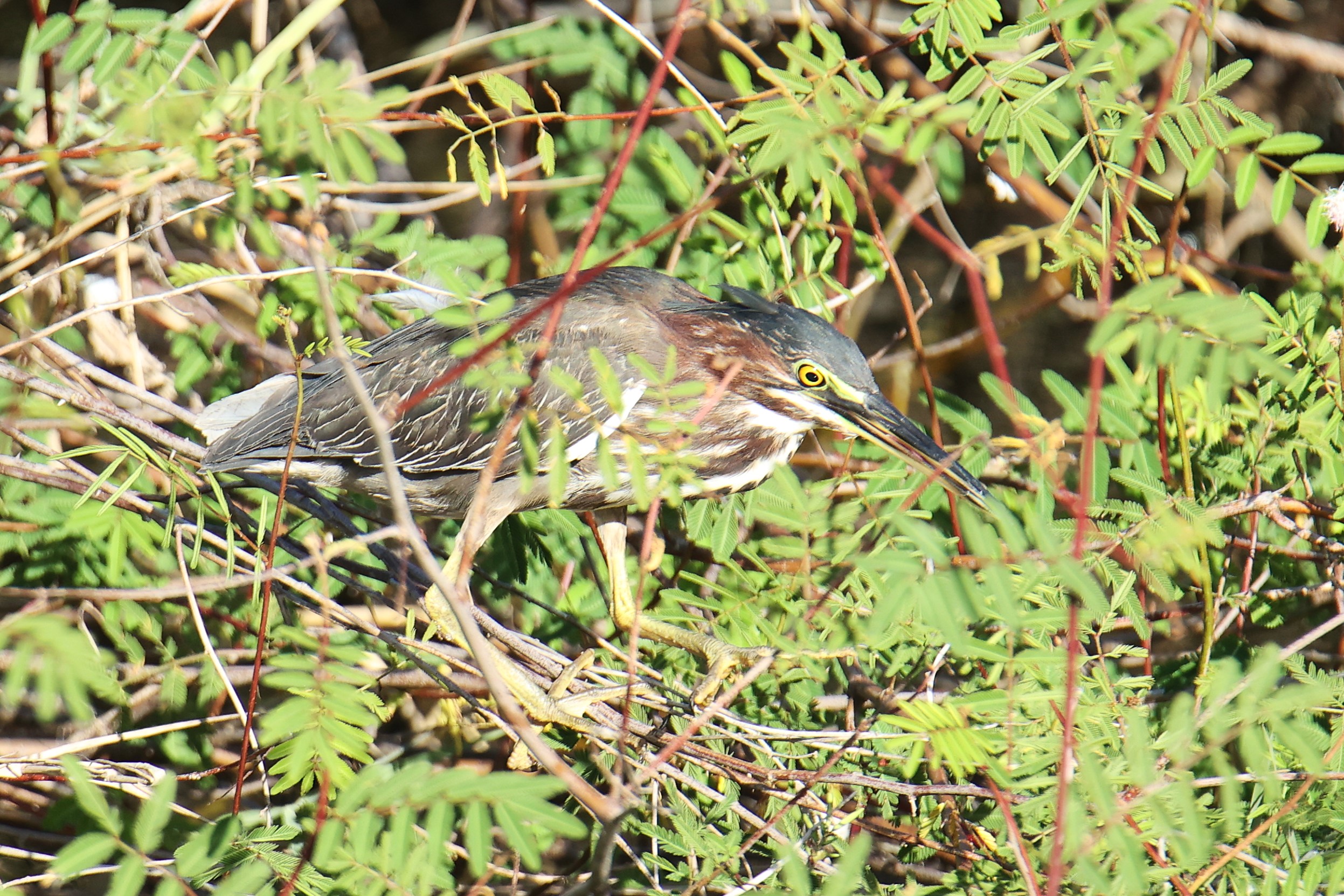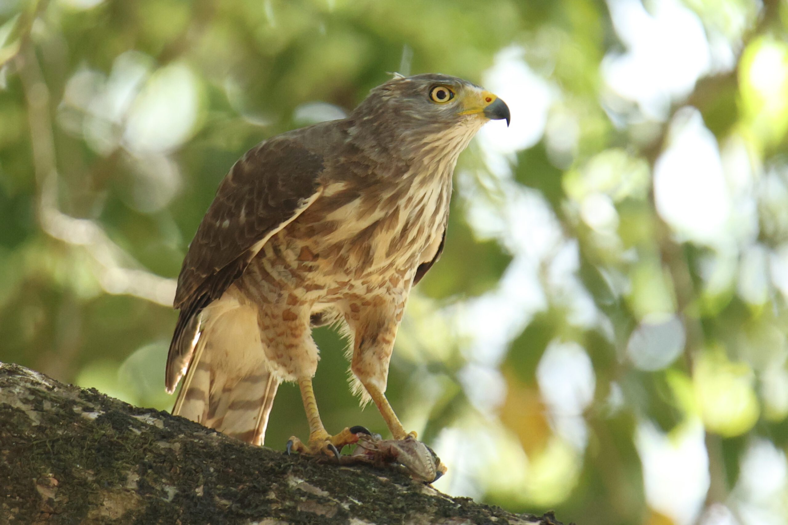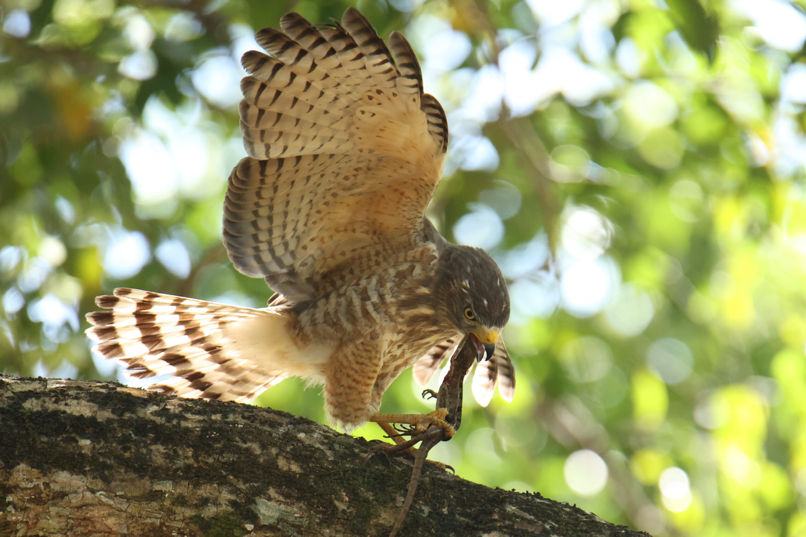 Ein erstes Vogel-Highlight erlebt Andrea schon am Eingangstor der Anlage, während ich noch mit dem Check-in beschäftigt bin. Ein Wegebussard hat eine für seine Verhältnisse riesige Echse erbeutet – und kämpft sichtlich damit, die Beute zu verspeisen. Die Echse setzt sich massiv zur Wehr und schafft es, sich am Kopf des Bussards festzubeißen …