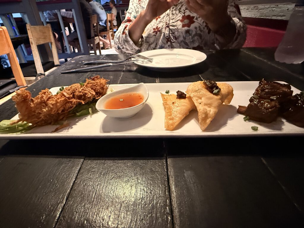 Gleich im Anschluss essen wir im „Hibisca By Habanero“ zu Abend. Etwas hochpreisiger, aber sehr köstlich. Wir teilen uns das Appetizer Trio: (This trio of appetizers comes with a sample of one Pari-Pari rice cake, one Aristaes húntun and one coconut sneaky shrimp skewer)