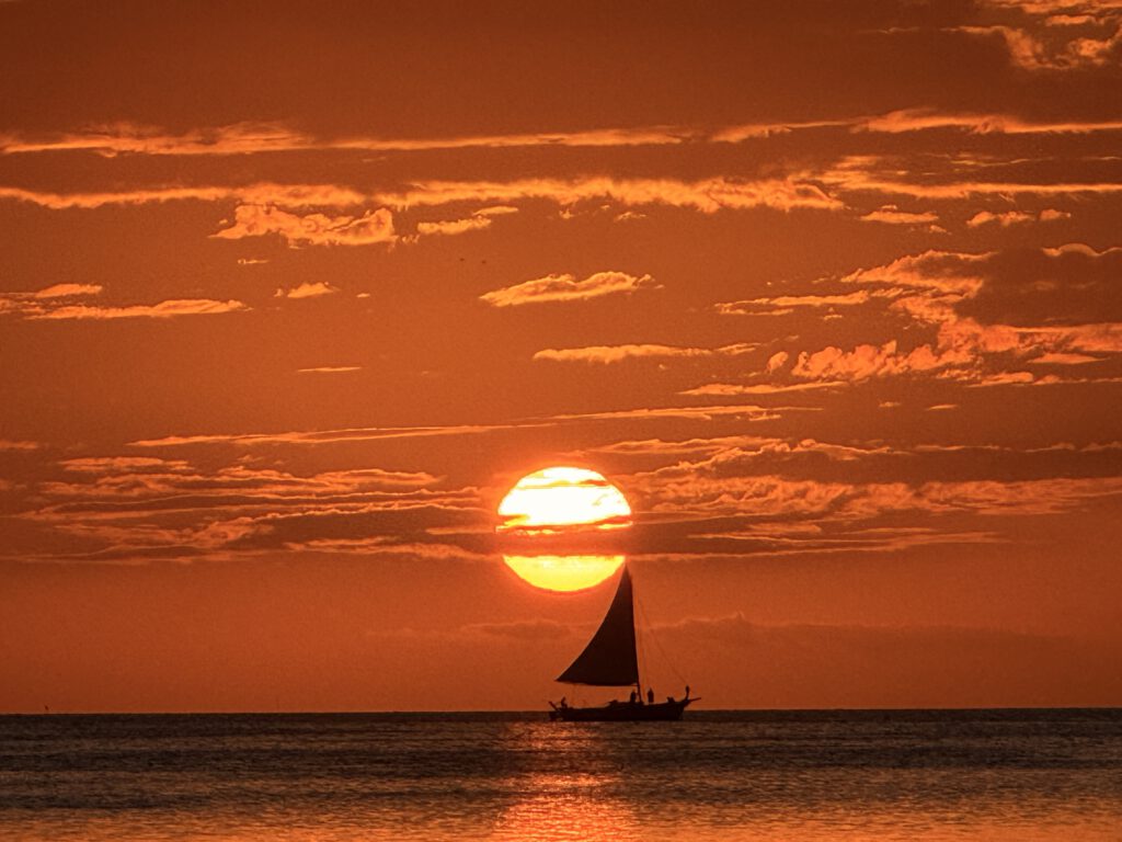 Wir finden uns rechtzeitig am Strand in der „The Pelican Sunset Bar“ ein, um den Sonnenuntergang (gegen 18 Uhr), wie schon an unserem ersten Abend auf CC, genießen zu können. Nachdem die Sonne mit einem fulminanten Farbenspiel im Meer versunken ist, bestellen wir Fischcurry beziehungsweise gegrillten Red Snapper und feiern unseren Abschied von CC – denn morgen geht es zurück aufs Festland und übermorgen in den Flieger nach Frankfurt.