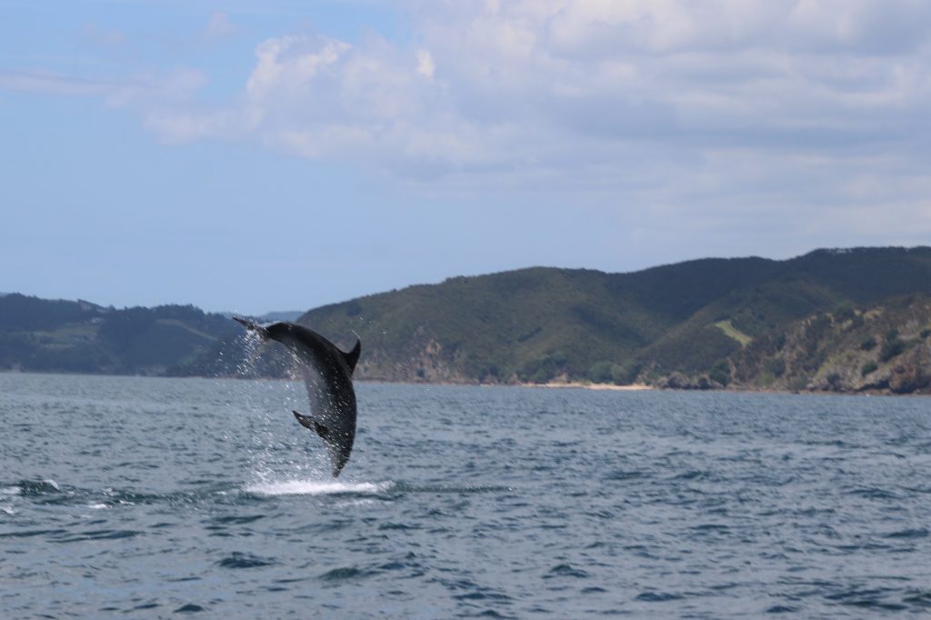 Kurze Sicherheitseinweisung an Bord und eine Erklärung, wie die Tour funktioniert und unser Jetboot legt los. Schon nach wenigen Minuten tauchen einige der unverkennbaren Delfinflossen vor uns auf. Wir kommen den Tieren näher und erkennen, dass es sich um eine größere Gruppe handelt. Ich schätze es sind ca. 20 Delfine, die damit beschäftigt sind, Fische zu jagen. Dabei bewegen sie sich Kreuz und quer hin und her und unser Boot folgt ihnen dabei. Mitunter kommen die Delfine ganz nahe zu uns heran, auf Armlänge, und wir können sie gut beobachten.
