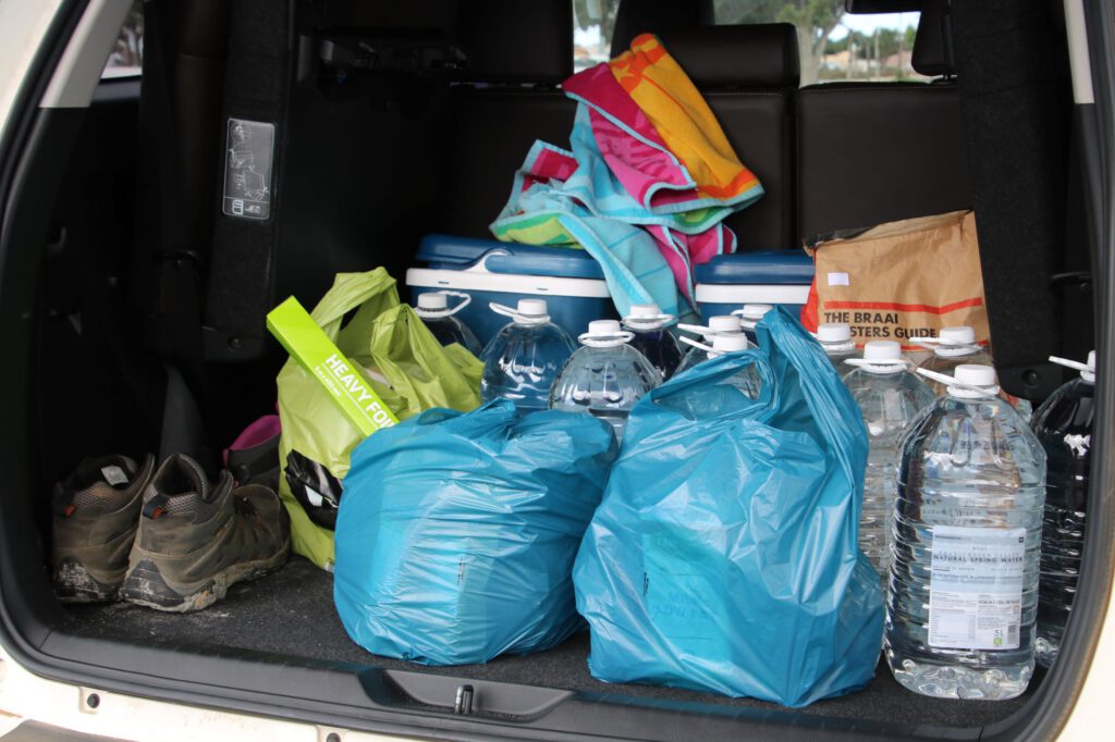 Auf dem Rückweg stand eine wichtige Versorgungsfahrt auf dem Programm. In der Weskus Mall in Vredenberg kaufen wir 60 Liter Wasser und Verpflegung für die nächsten Tage ein, denn da werden wir nicht immer in den Genuss kommen, dass ein Frühstück auf dem Tisch steht und dass ein Restaurant in greifbarer Nähe ist. Wir werden berichten!