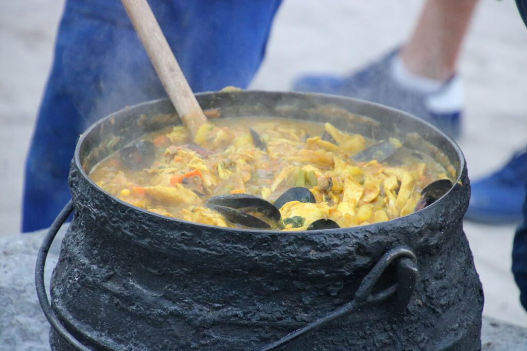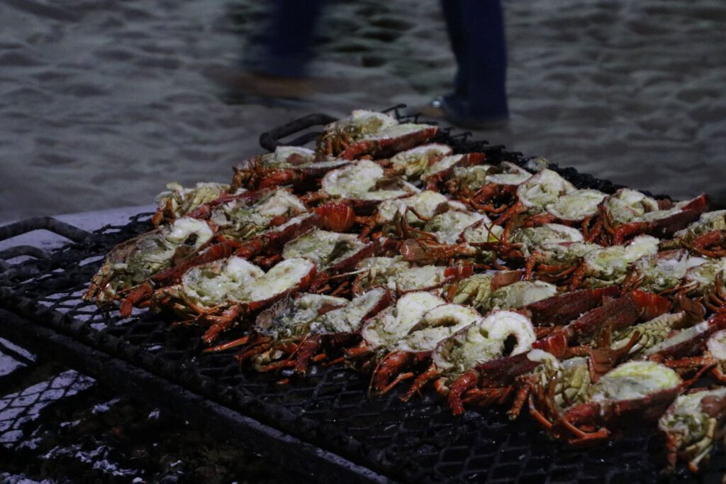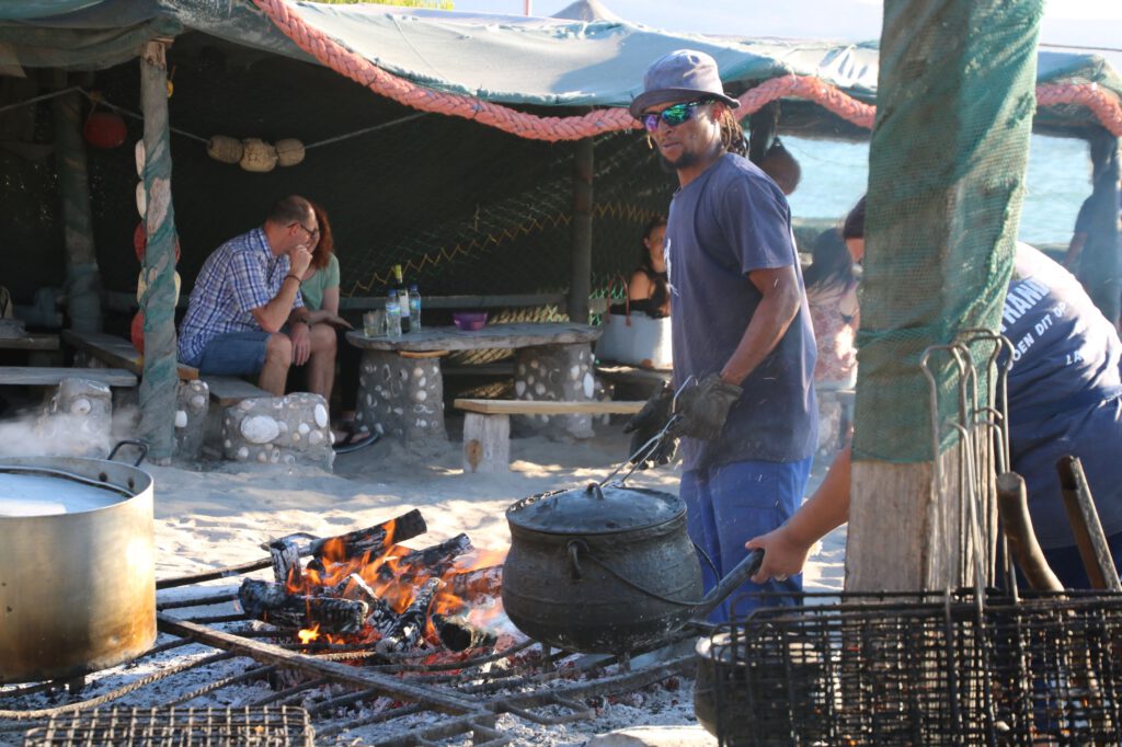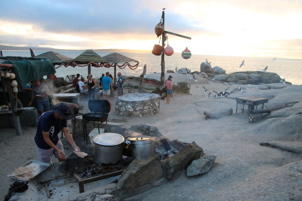 Ein paar Holzpfosten in den Strand gerammt, Netze darüber gespannt, Bojen und Muscheln als Deko, kleine Holzbänke und Tische, in der Mitte mehrere Feuerstellen, an denen gegrillt und gebrutzelt wird. Es gibt kein Besteck, Muschelschalen ersetzen Löffel, Messer und Gabel. Wenn man – wie wir – keine eigenen Getränke mitgebracht hat, kauft man welche an der „Felsenbar“. Immer wieder ist irgendein Gang fertig, man geht zum Grill und lässt sich etwas auf den Teller legen, frei nach dem Motto „all you can eat“.