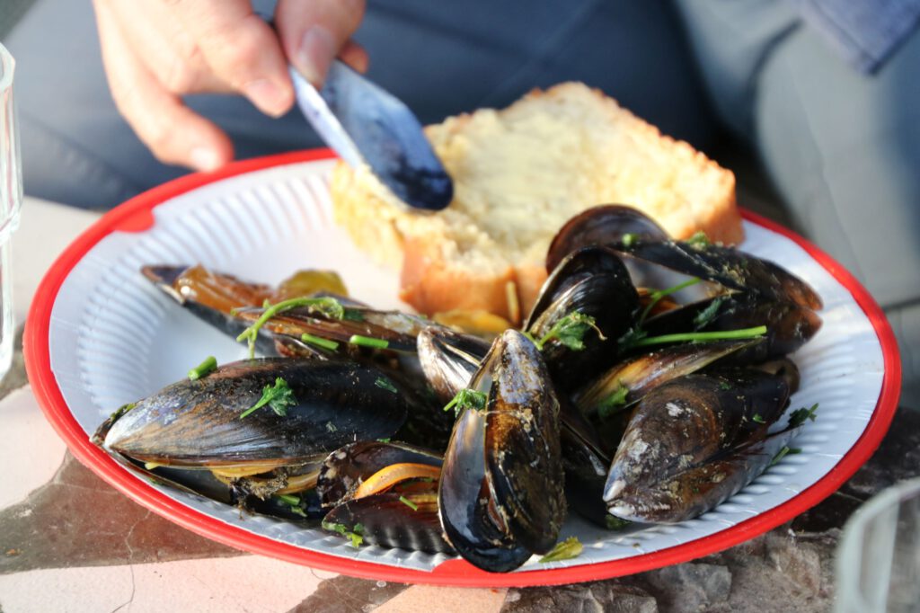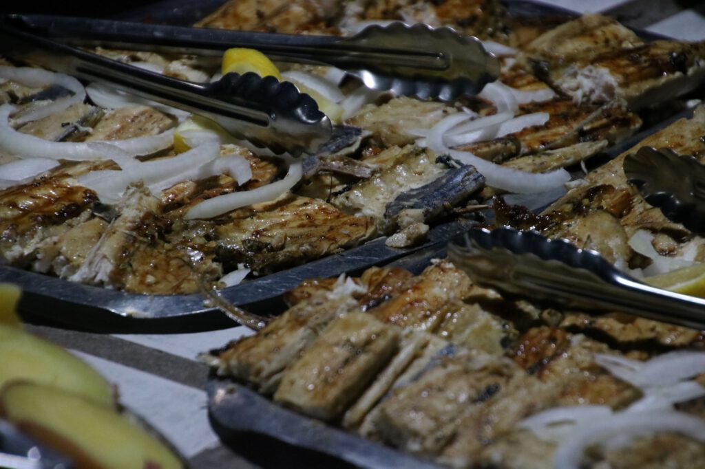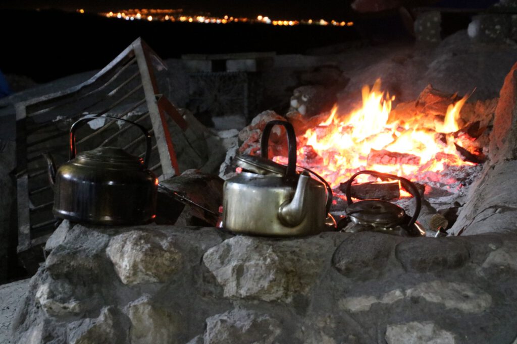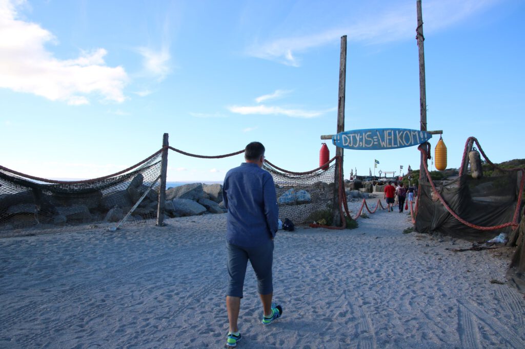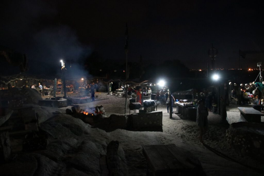 Ein paar Holzpfosten in den Strand gerammt, Netze darüber gespannt, Bojen und Muscheln als Deko, kleine Holzbänke und Tische, in der Mitte mehrere Feuerstellen, an denen gegrillt und gebrutzelt wird. Es gibt kein Besteck, Muschelschalen ersetzen Löffel, Messer und Gabel. Wenn man – wie wir – keine eigenen Getränke mitgebracht hat, kauft man welche an der „Felsenbar“. Immer wieder ist irgendein Gang fertig, man geht zum Grill und lässt sich etwas auf den Teller legen, frei nach dem Motto „all you can eat“.