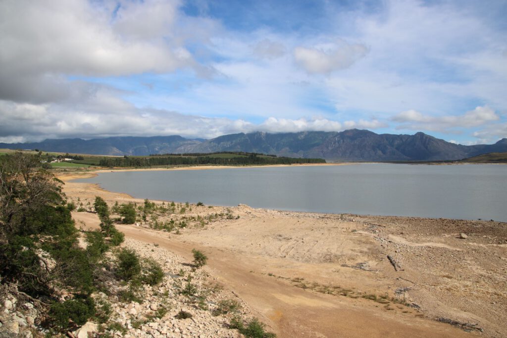 Nach weniger als einer halben Stunde sind wir am Stausee, machen einen kurzen Fotostopp und fahren den Pass wieder hoch. Na ja: sooo wahnsinnig fotogen ist der See dann halt doch nicht. Außerdem ist der Wasserspiegel verdächtig niedrig. Es muss vor einem Jahr noch viel weniger Wasser drin gewesen sein. Seit 4 Jahren ist es am Western Cape viel zu trocken!