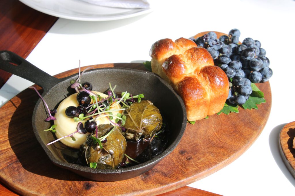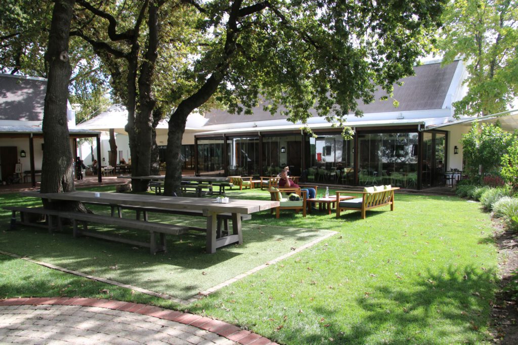 Schon 2015 hatten wir es besucht und da es uns damals so gut gefiel und die Weine erstklassig sind, steht es heute „auf unserer Liste“. Außerdem hatten wir damals keine Zeit, bei La Motte zu Mittag zu essen. Das wollen wir heute nachholen. Das Restaurant ist für seine Qualität bekannt. Draußen im Garten können wir wunderbar unter uralten Eichen in hölzernen Loungemöbeln sitzen und unseren Lunch einnehmen: African Cheese Platter (w) und Harvest Plate (a), abgeschlossen durch je ein Stück Kuchen zum Espresso.