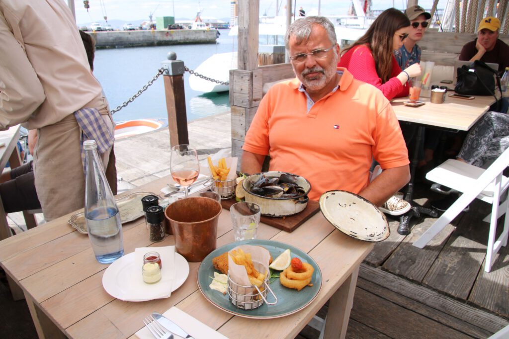 Wir lassen uns in einem Restaurant an der Waterfront auf einem Holzdeck direkt an einem der Hafenbecken zum Mittagessen nieder. Es gibt „Steamed Mussels“ (w) und „Fried Hake“ (a) jeweils mit Pommes.