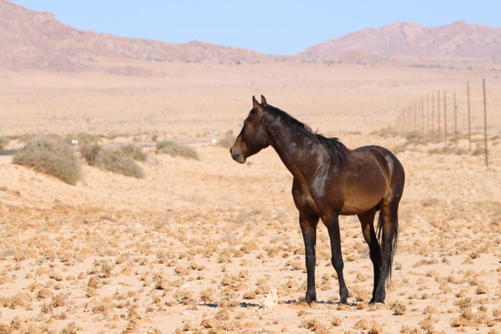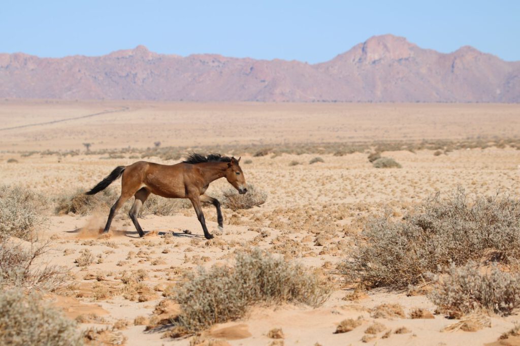 Gegen 15:30 Uhr machen wir uns auf den Rückweg. Auf dem Rückweg entdecken wir bei Garub schon von der Straße aus drfei Wüstenpferde, zwei erwachsene und ein Fohlen. Was haben wir doch für ein Glück! Die Tiere kommen gerade von der Wasserstelle und wir können sie aus nächster Nähe beobachten!