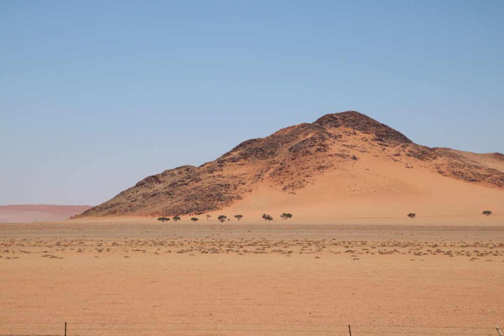 Schon von Beginn unserer Fahrt an zieht uns wieder die einmalige Landschaft in ihren Bann: zunächst die in Pastelltönen aus dem gelblichen Untergrund herausragenden Berge, später am Horizont erkennbares Orange der Namib. Wir passieren den „Ort“ Tirool und biegen westlich auf die D707 ab, eine der schönsten Straßen Namibias, da sie sich am Rande der Namib auf der einen Seite und an den Tirasbergen auf der anderen Seite entlangschlängelt. Über Geschmack lässt sich bekanntlich vortrefflich streiten und so würde es uns nicht wundern, wenn der ein oder andere unserer Blogleser unsere Begeisterung für diese Wüste nicht teilen kann. Doch wir staunen in einem fort über die sich ständig ändernde Landschaft und deren Farbgebung.