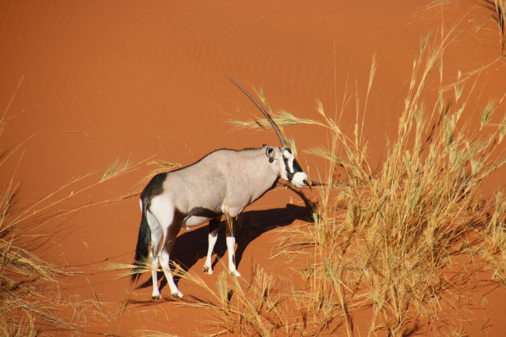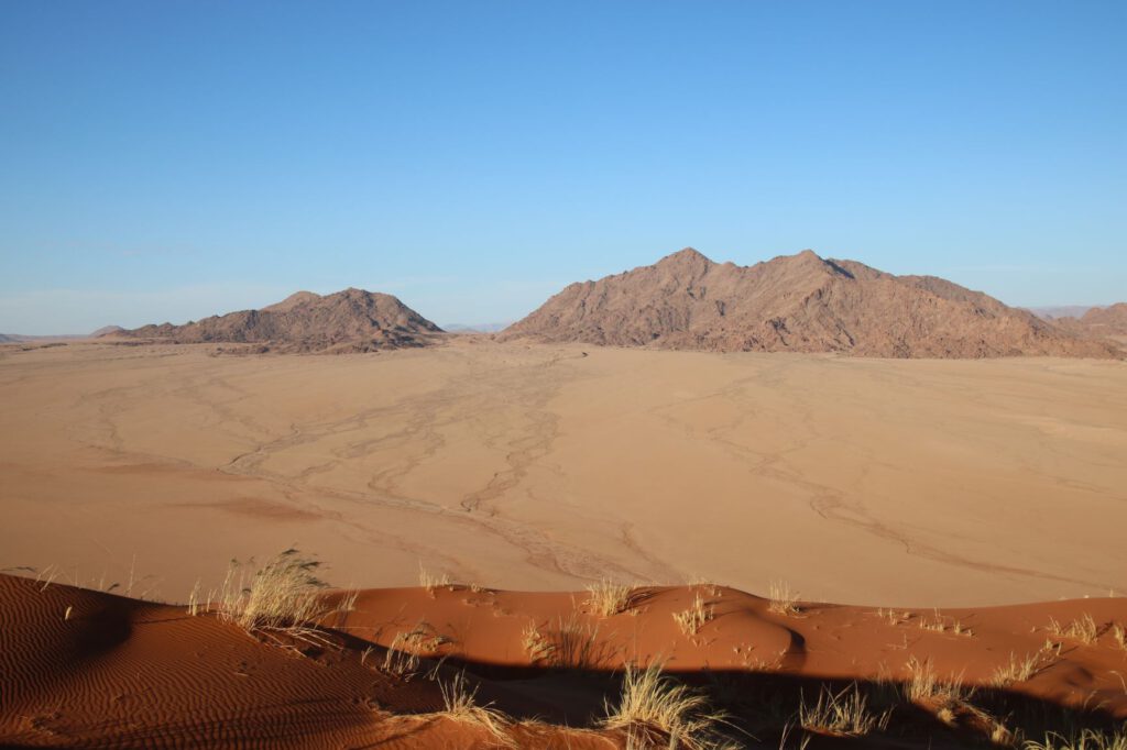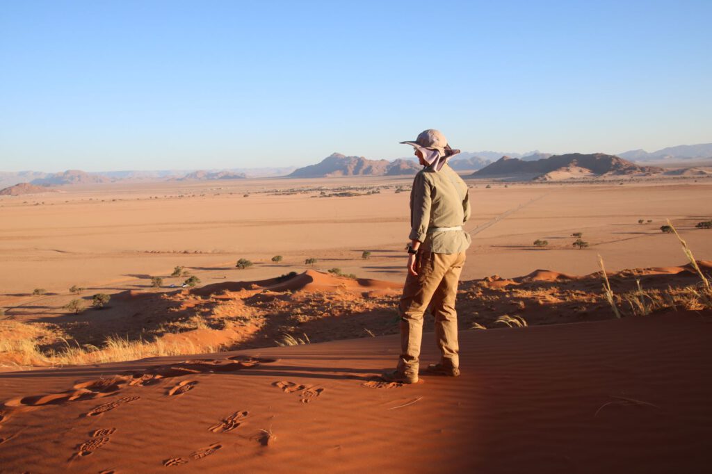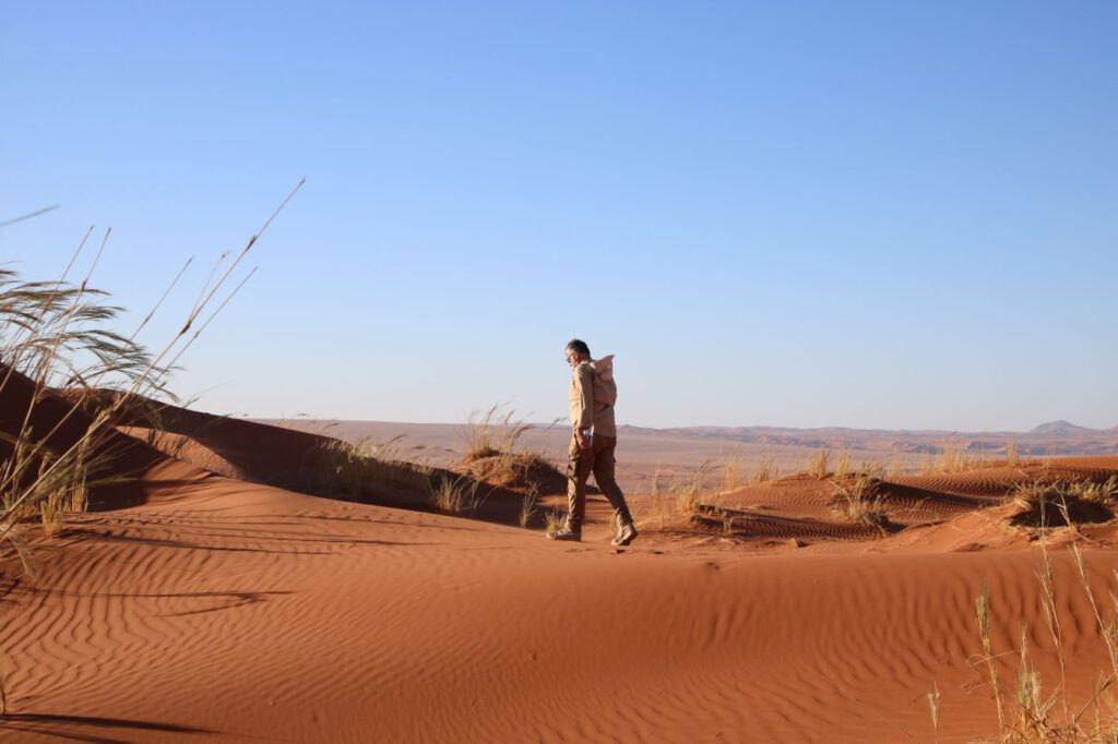 Andrew holt uns um 5:45 Uhr zu einem „educational morning walk“ ab. Also einem lehrreichen Spaziergang durch die Dünen. Hart formuliert, haben wir uns mit Fußabdrücken und Tierkot beschäftigt. In der Wüste findet das Leben nämlich weitestgehend in der Nacht statt. Am Morgen danach sieht man dann, was die Tiere hinterlassen haben. Im Sand kann man lesen wie in einem Buch. Andrew erklärt uns die Spuren von afrikanischen Maulwürfen, die Fußabdrücke der tanzenden weißen Spinne bis zu den Fußabdrücken eines Stinktiers. Es ist viel interessanter, als es sich anhört. Und man darf dabei auch nicht vergessen, in welch herrlicher Landschaft dies alles stattfindet. Nach 2 ¼ Stunden endet der lehrreiche „walk“ durch die Dünen.