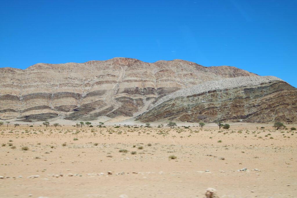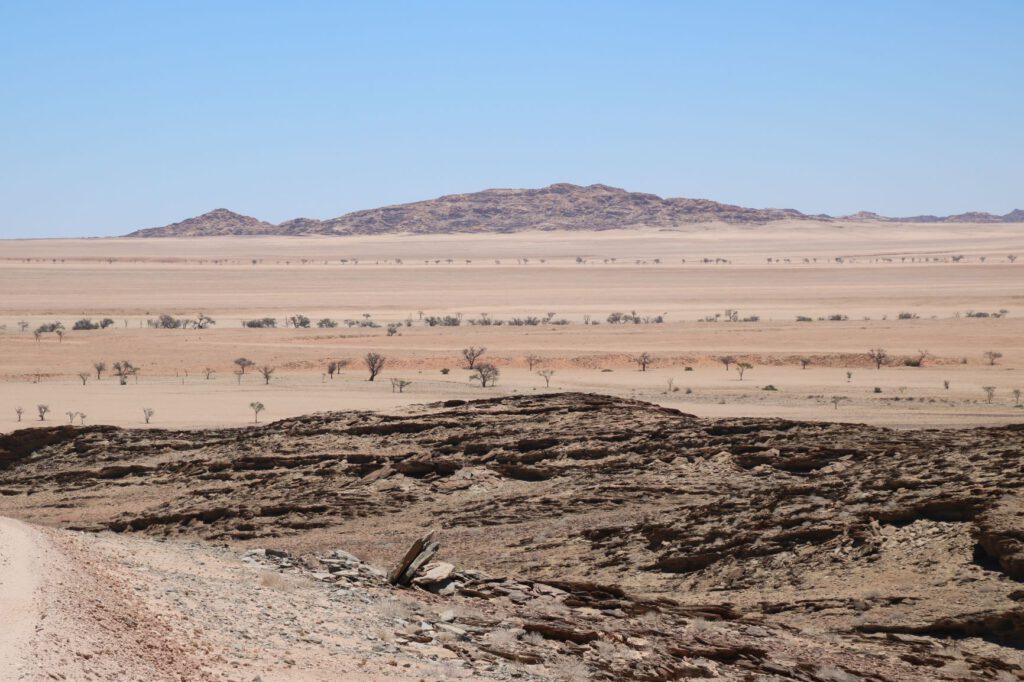Die Landschaft zwischen Sesriem und Solitaire ist sehr vielseitig. Entlang der C19 begleiten Dünen am Horizont unseren Weg. Und wieder ist uns die „Sichtungsfee“ hold: kaum zu glauben, aber wahr, am Fahrbahnrand steht eines der seltenen Hartmann-Berg-Zebras und das sogar außerhalb des Nationalparks. Es überquert in einiger Entfernung von uns die Piste, bleibt teils interessiert, teils misstrauisch stehen und galoppiert dann doch schleunigst davon.