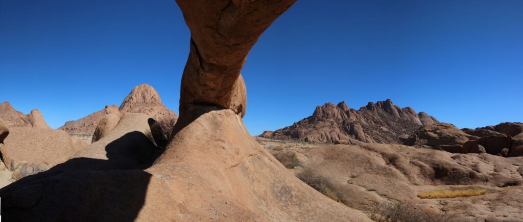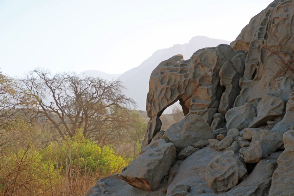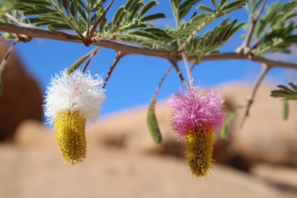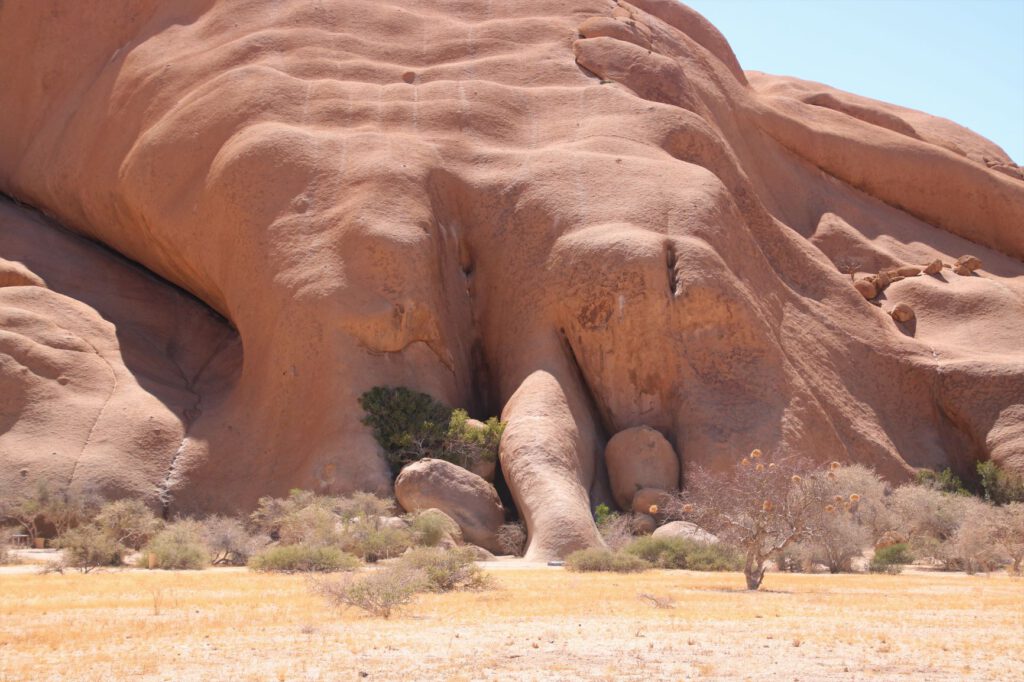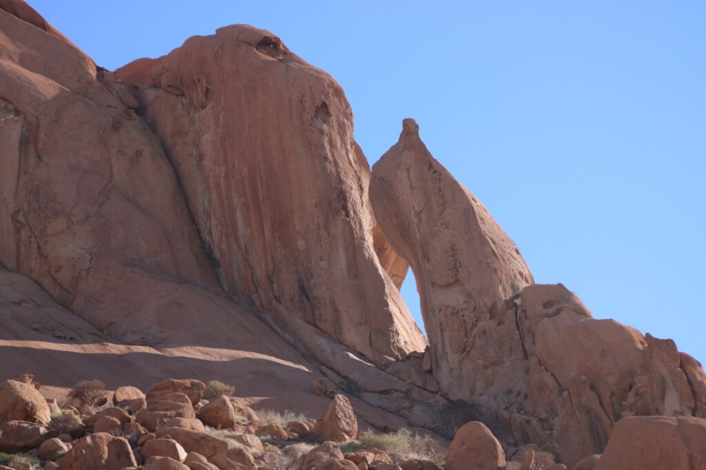 Wir legen die kurze Strecke zum Felsenbogen zu Fuß zurück, obwohl die Temperatur schon mächtig ansteigt. Am Felsenbogen angelangt, stellt sich aber nicht nur dieser außergewöhnliche Fels als Attraktion heraus, denn in nächster Umgebung entdecken wir zauberhafte Blüten an dornenbewachsenen Büschen (Farbkätzchensträucher) sowie farbenprächtige namibische Felsagamen (Agama planiceps). Das männliche Reptil hat eine so eigentümliche orange-dunkelblaue Farbgebung , dass es uns eher an ein schlecht gestaltetes Plastikspielzeug erinnert, als an ein lebendiges Tier.
