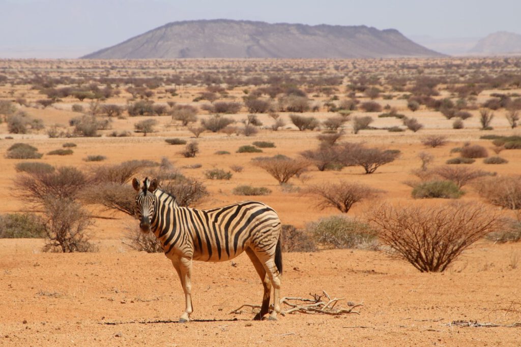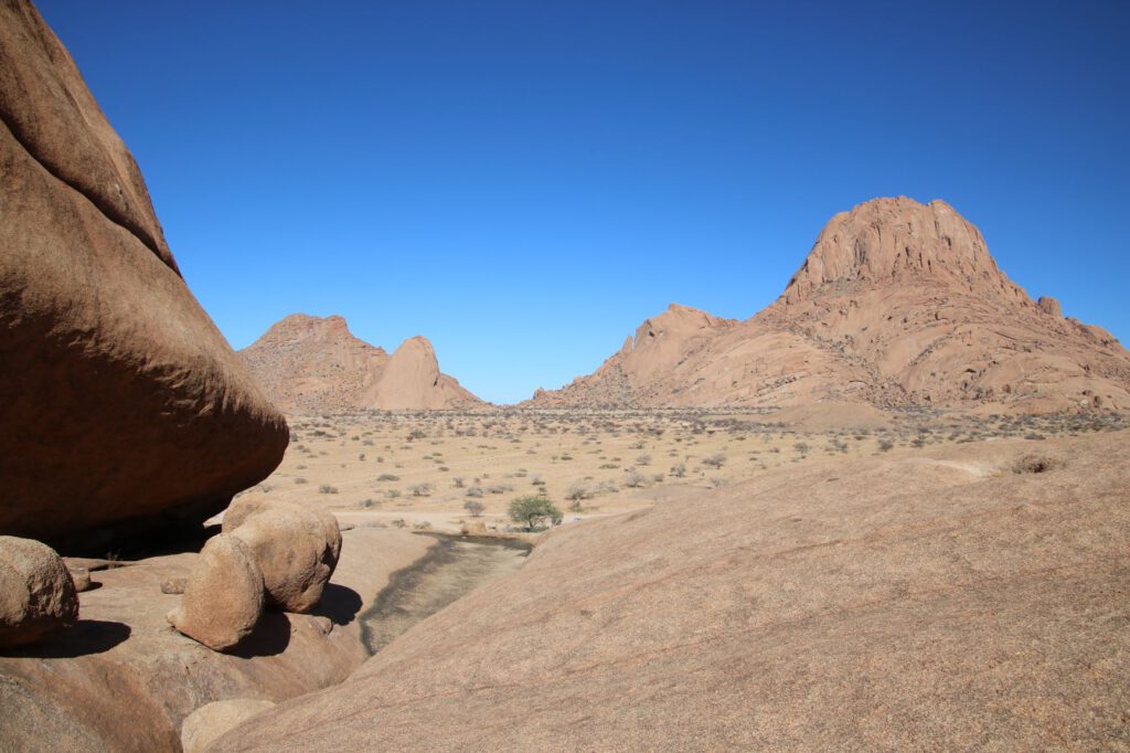 Schon aus weiter Entfernung konnten wir den Brandberg am Horizont ausmachten, ein gewaltiges Bergmassiv von fast runder Form (30 Kilometer Durchmesser), das seine Umgebung im Durchschnitt um fast 2.000 m überragt. Sein höchster Gipfel ist mit 2580 m der Königstein, der zugleich auch der höchste Berg Namibias ist.
