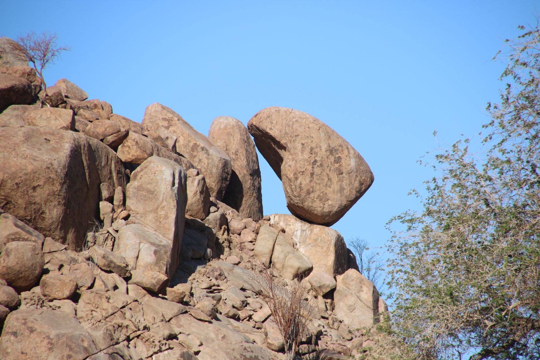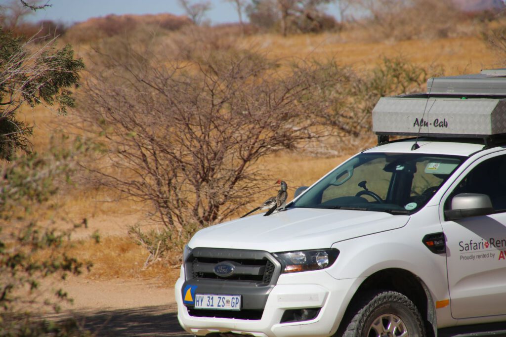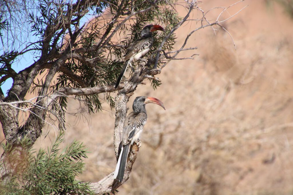 Wir fahren kurz nach acht Uhr Richtung Bogenfelsen, eine Art natürliche „Brücke“ aus Fels und somit etwas ganz Besonderes. Auf dem Weg dorthin machen wir einen kurzen Stopp am Rockpool, einem großen Becken im Stein, das leider nur äußerst selten mit Wasser gefüllt ist. Auf dem Rückweg zum Auto staunen wir nicht schlecht über ein Hornbill-Pärchen (Toko, vielen bekannt als „Zazu“ in „König der Löwen“), das auf unserer Motorhaube herumhüpft und kräftig gegen die Windschutzscheibe klopft. Beim Näherkommen fliegen die beiden allerdings in den nächsten Baum und tun so, als ob sie kein Wässerchen trüben könnten.