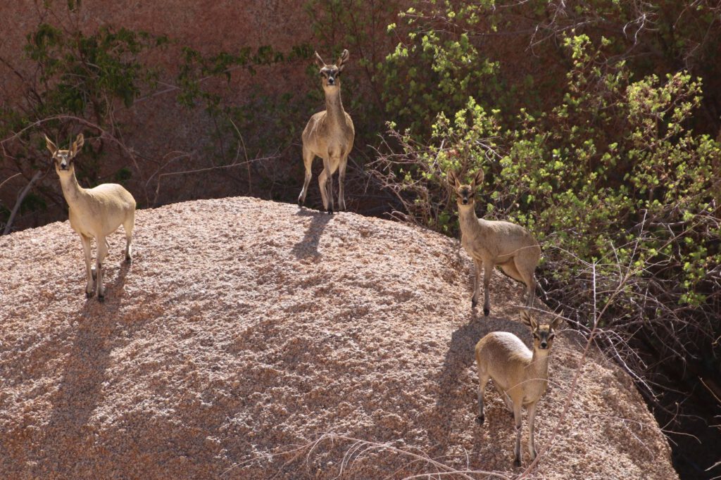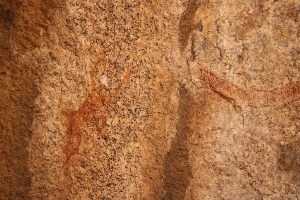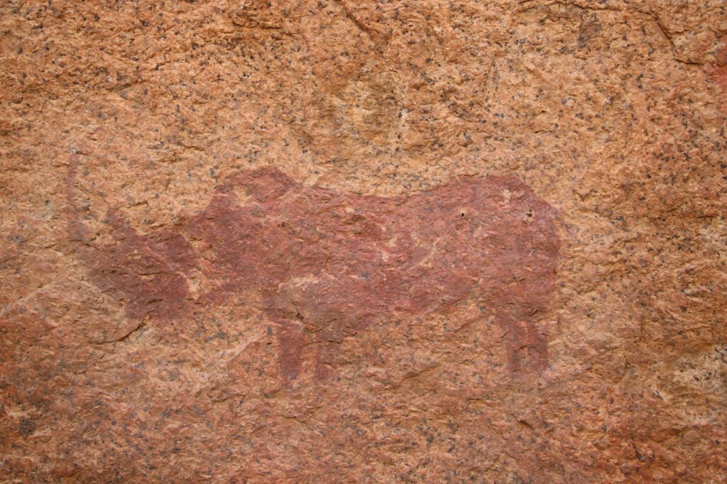Vollkommen begeistert kommen wir wieder am Wagen an und fahren in Richtung Durchlass zwischen der Spitzkoppe und den Pontok-Bergen, weil wir auch den nördlichen Parkteil besichtigen wollen. Zum Glück treffen wir kurz zuvor einen einheimischen Guide (Volksstamm Damara), ein junger Mann, der sich anbietet, uns in der nächsten Stunde die bis zu 4000 Jahre alten Felsmalereien zu zeigen. Er erklärt uns nicht nur die Malereien, sondern vermittelt uns viel Hintergrundwissen inklusive der „Klick“-Sprache. Für uns absolut schleierhaft, wie man vier verschiedene Klicklaute verzögerungsfrei in den Redefluss einbauen kann. Netterweise dürfen wir sogar ein Video von seinem Sprachkurs aufnehmen.