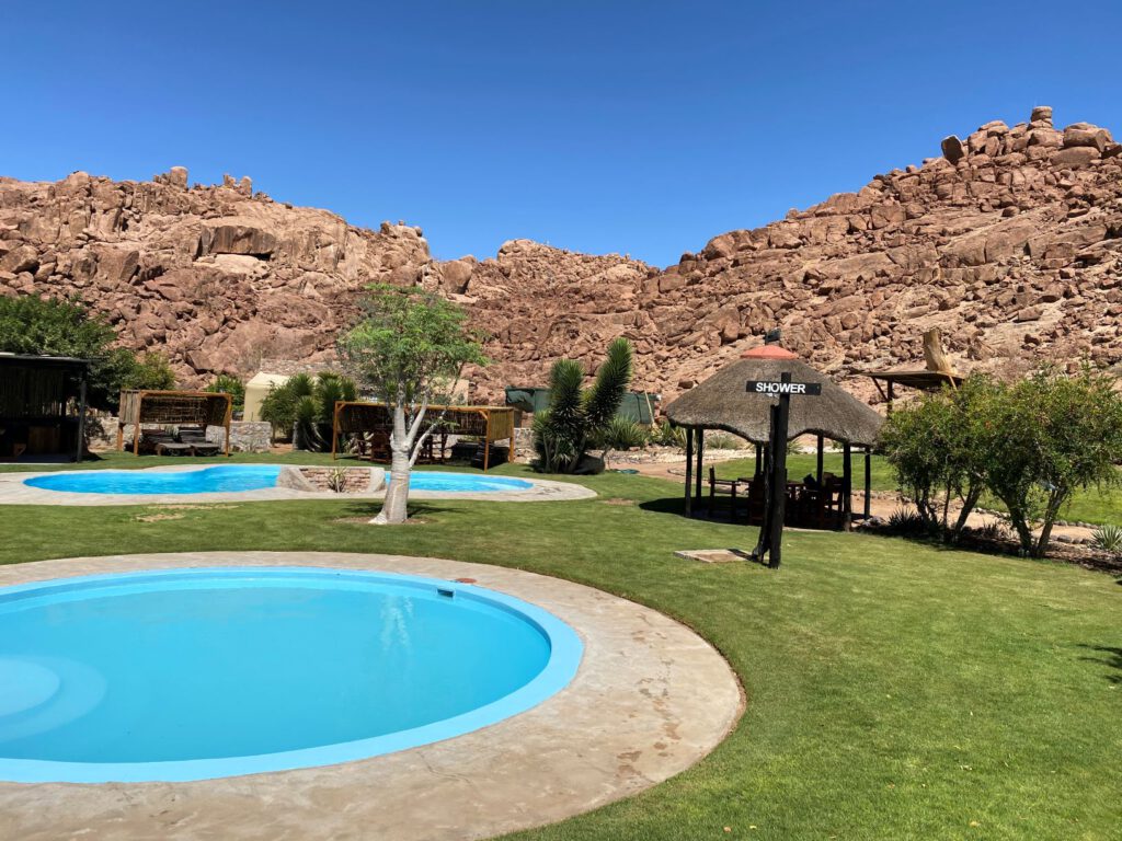 Um 14:30 Uhr treffen wir in der Brandberg White Lady Lodge ein, beziehen unser Chalet und legen uns kurz darauf an den wunderschönen Pool in der gepflegten Gartenanlage. Hier lässt es sich aushalten, zumal wir wieder einmal fast die einzigen Gäste auf dem weitläufigen Gelände sind.