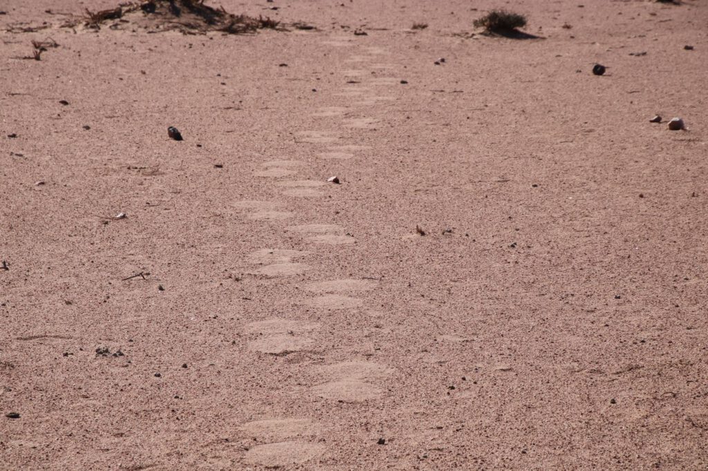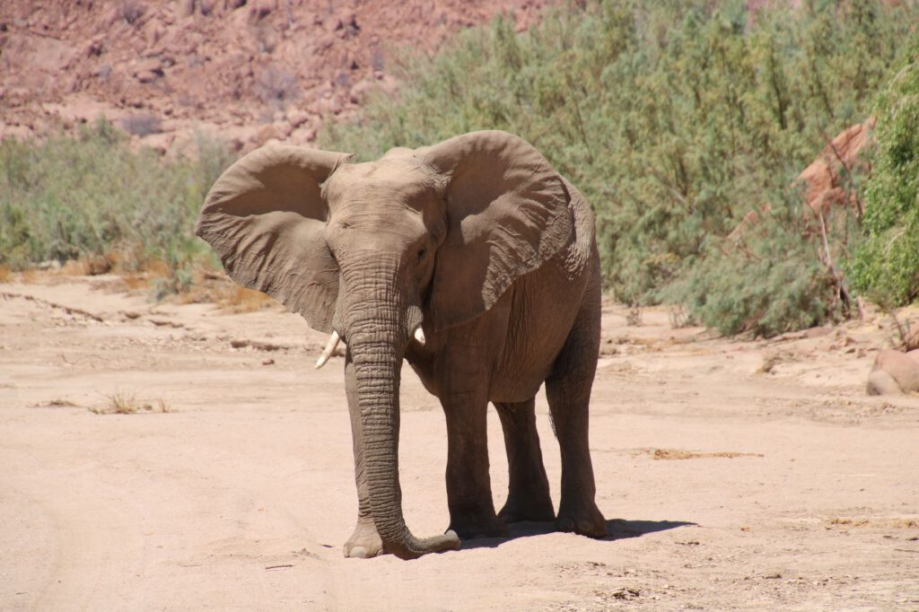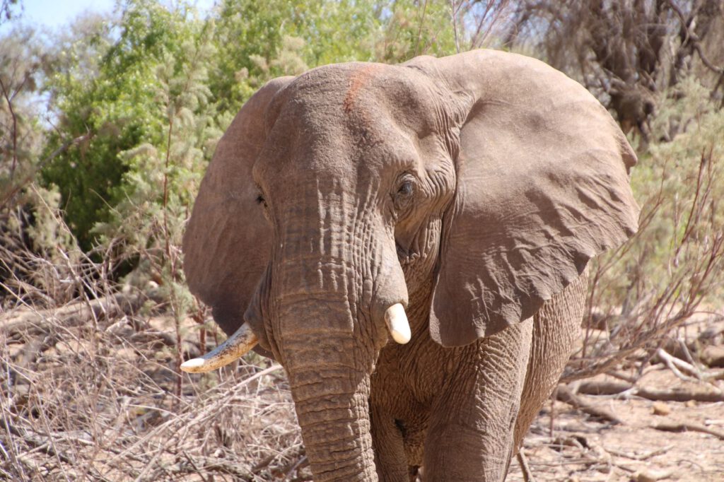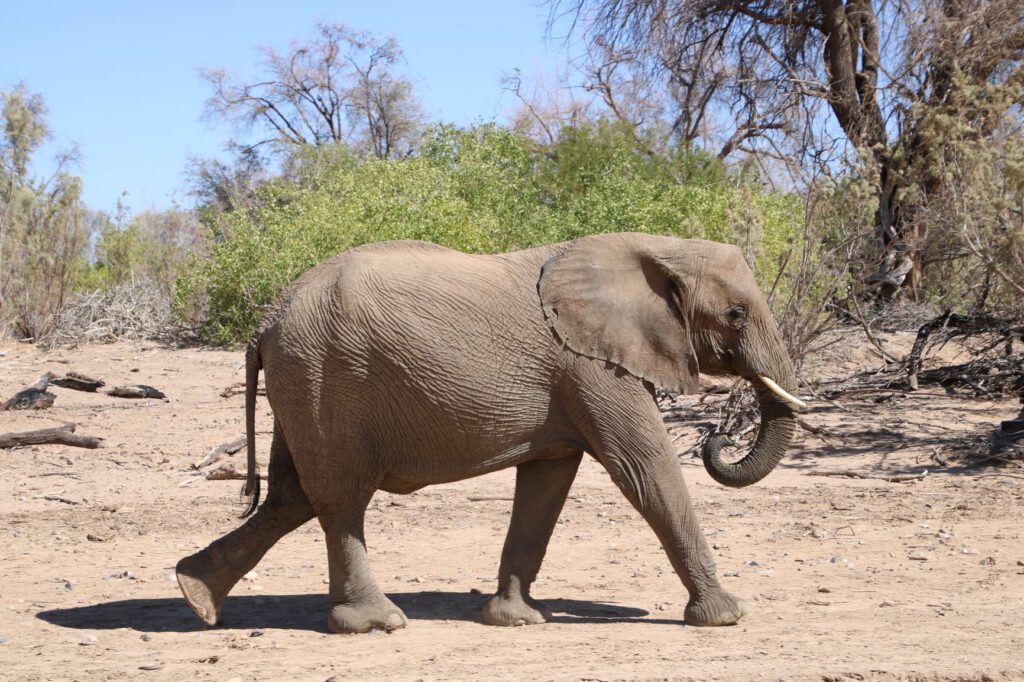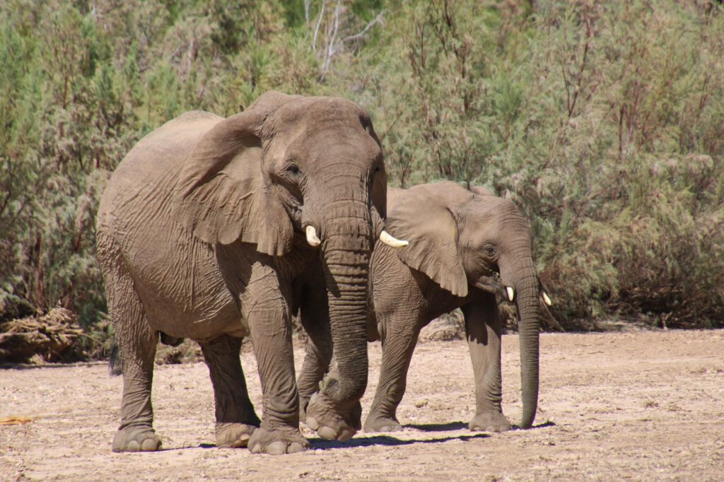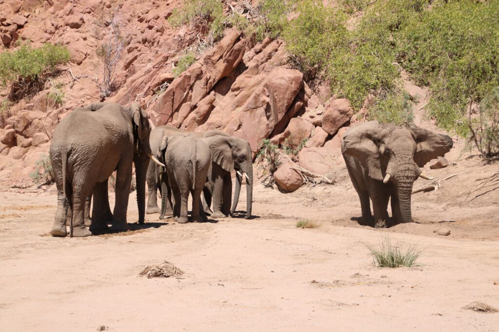 Wir sind auf eine Gruppe von zwei Bullen, mehreren Muttertieren und Jungen getroffen. Insgesamt handelt es sich um 12 Tiere. Die Wüstenelefanten leben hier unter sehr schwierigen Bedingungen: wenig Wasser, wenig Futter, große Hitze, manchmal sogar Sandstürme. Das hat bei den Tieren zu einer Anpassung an den Lebensraum geführt, nämlich einer geringeren Größe, kleineren Stoßzähnen und zu deutlich größeren Füßen, damit sie im Sand besser gehen können.