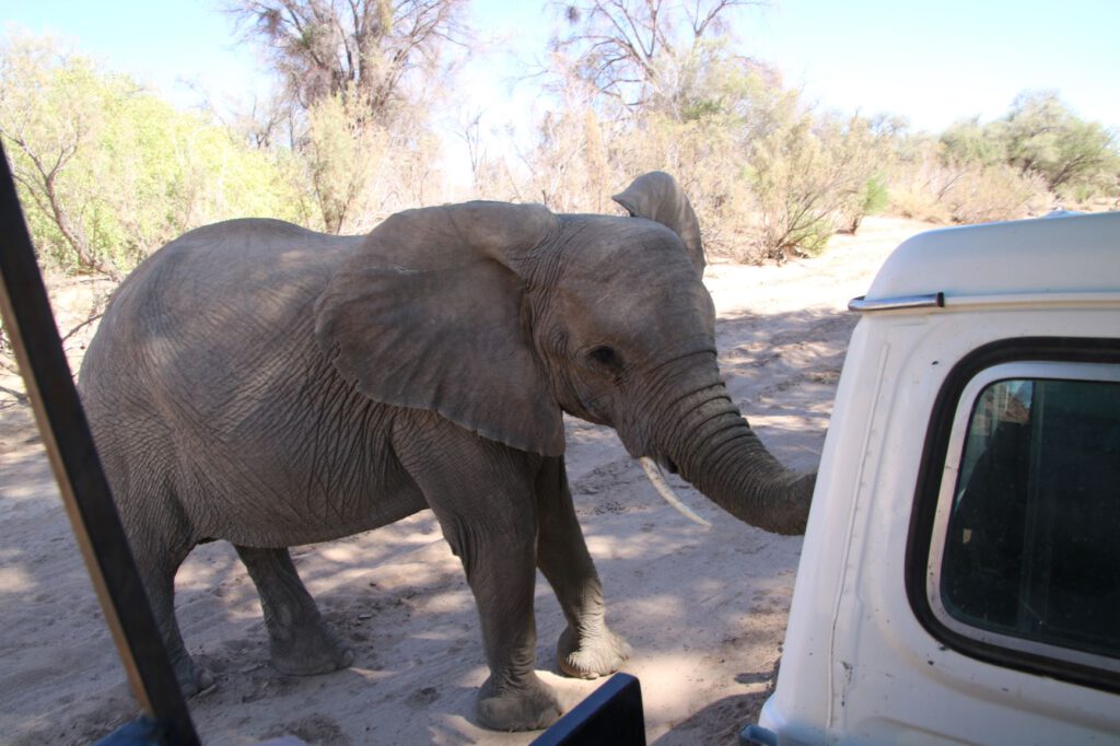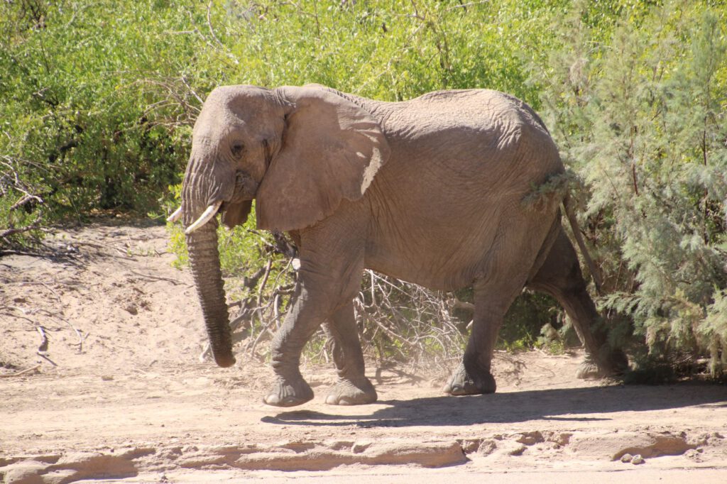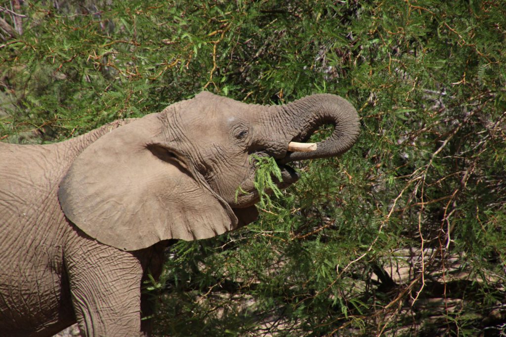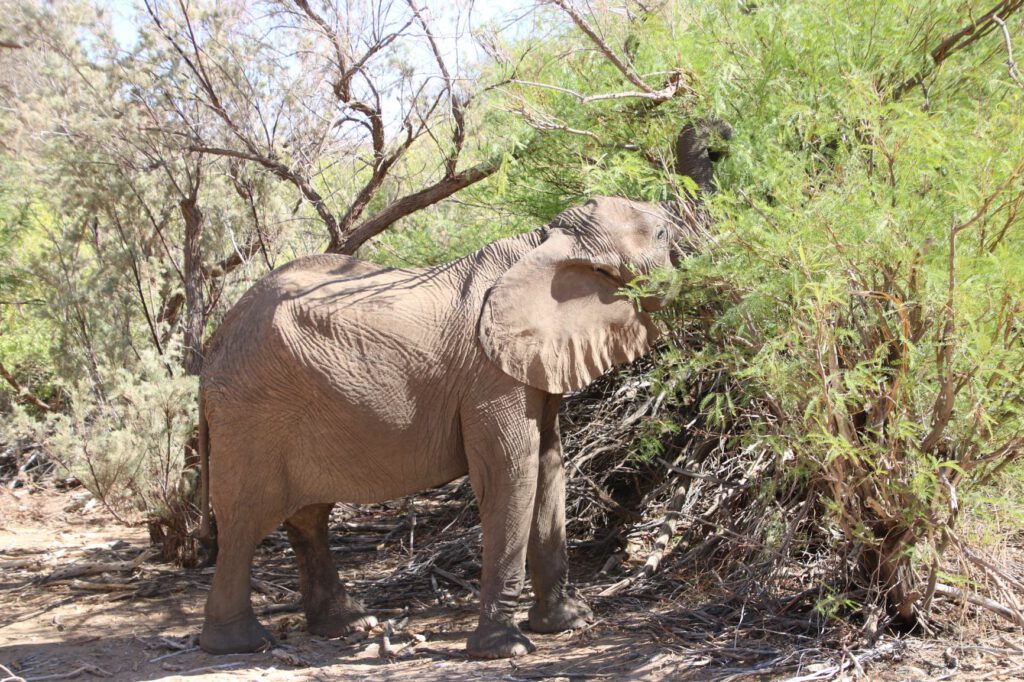 Calvin sucht nach einer größeren Gruppe Elefanten und hat eine Vorstellung davon, wo sie sich aufhalten könnte. Dazu fahren wir immer weiter ins Ugab-Tal hinein. Wieder sehen wir größere Mengen von frischen „Hinterlassenschaften“ von Elefanten. Die schiere Menge an frischem Kot lässt darauf deuten, dass wir von einer Herde nicht mehr weit entfernt sein können. Und da! Andrea entdeckt einen Dickhäuter im dichten Gebüsch. Calvin bestätigt die Sichtung und dirigiert den Toyota in die entsprechende Richtung. Als wir näherkommen, sehen wir weitere Wüstenelefanten, die vom reichlich vorhandenen Grünzeug der Bäume fressen.