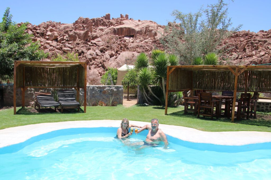 Der Rest des Tages ist schnell beschrieben: Baden im Pool (wieder keine anderen Gäste), ein Drink von der Bar, Relaxen pur, Bilder sichten, Text schreiben, Dinner und dann unters Moskitonetz zu hoffentlich erholsamem Nachtschlaf und Träumen von Wüstenelefanten.