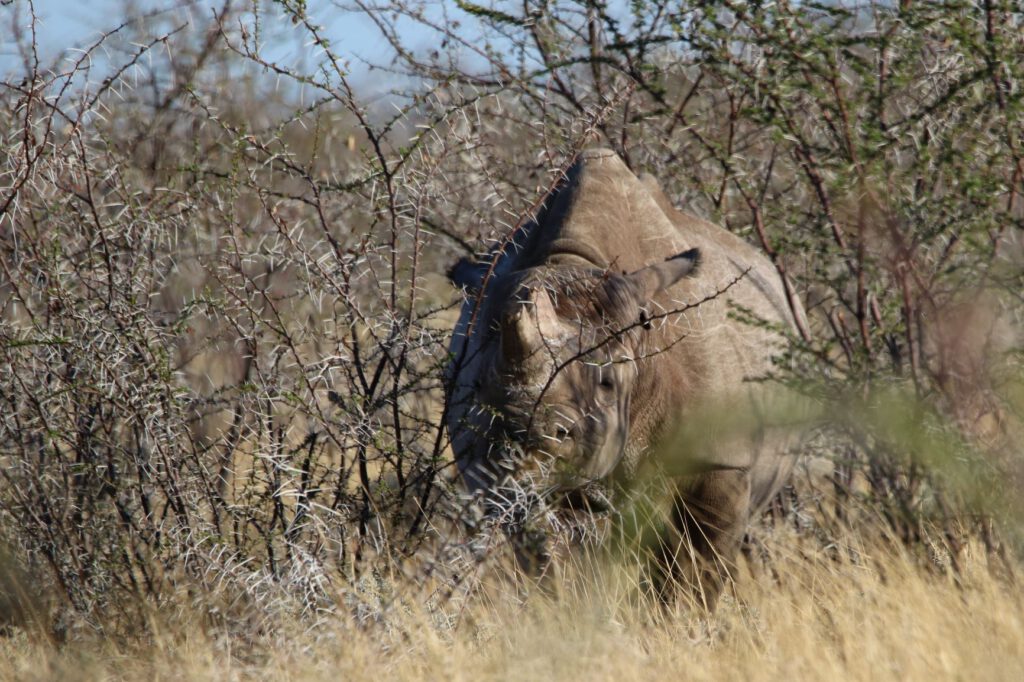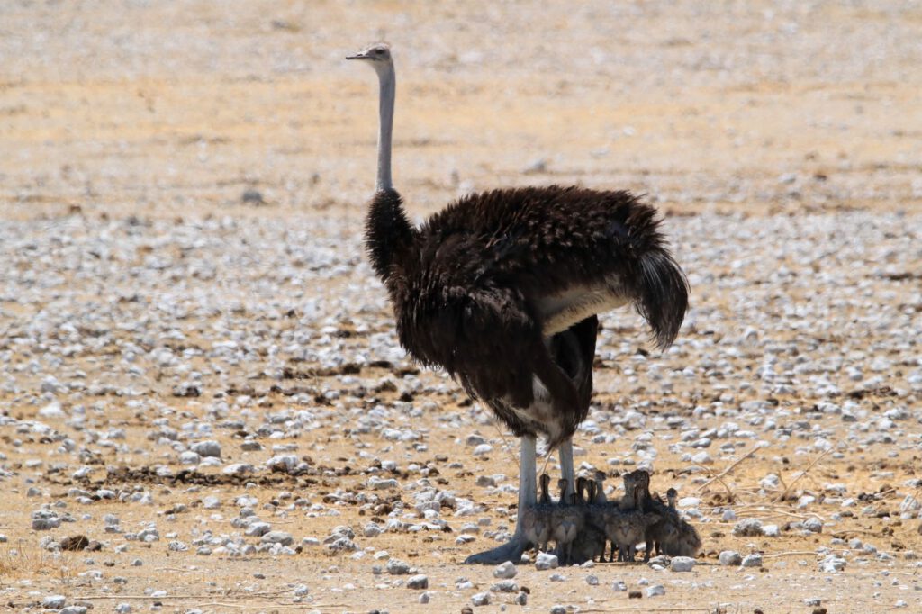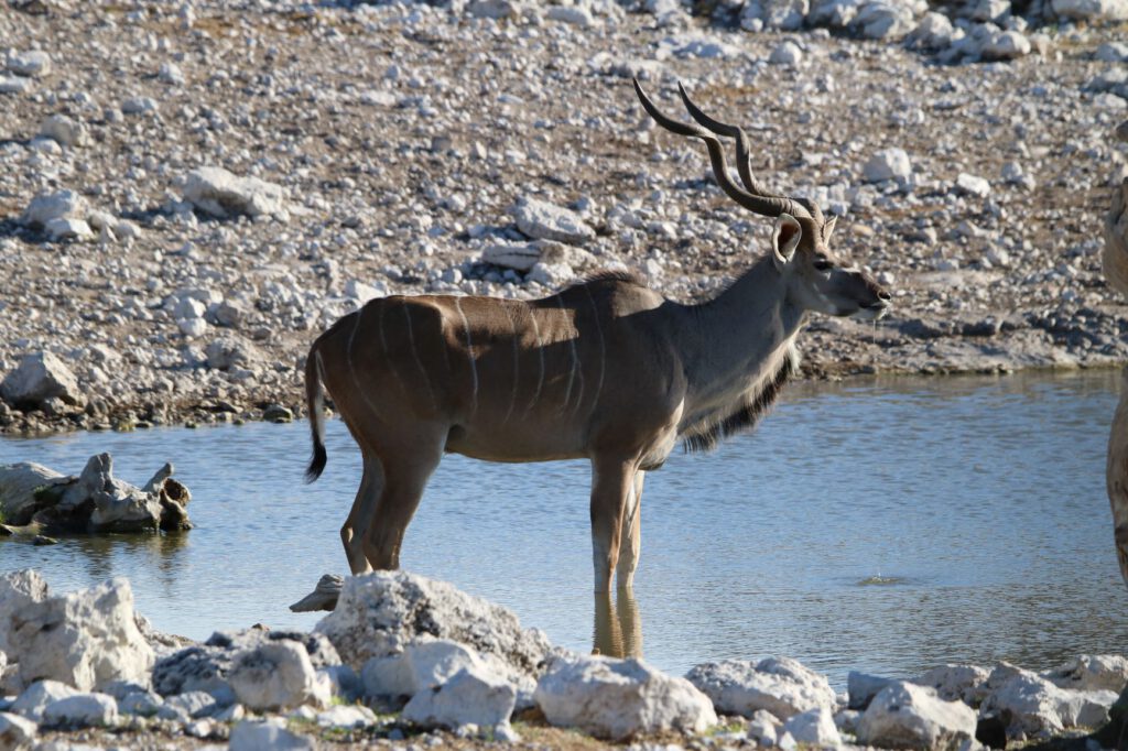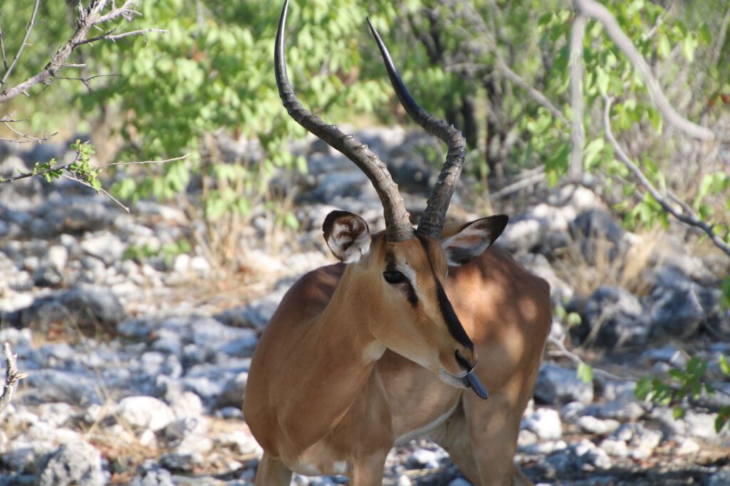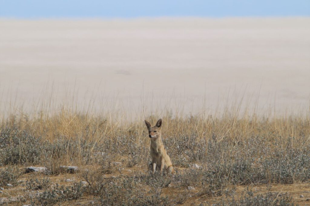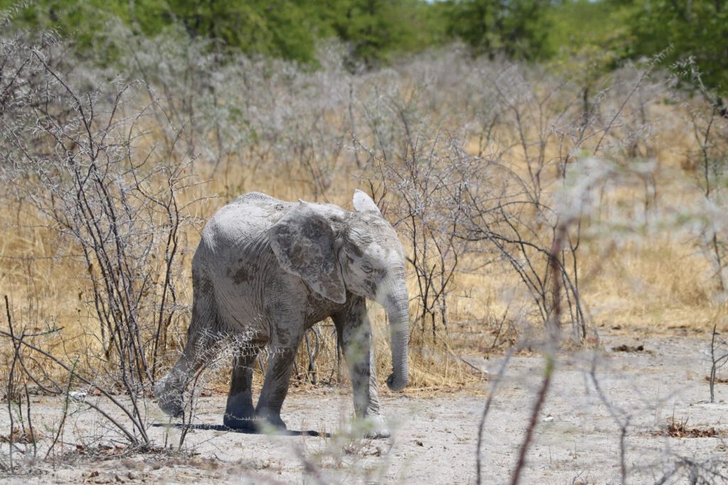 Halali, diesen ungewöhnlichen Namen trägt unser heutiges Ziel im Etosha Nationalpark. Wir wollen die kühleren Morgenstunden optimal nutzen. Daher stehen wir bereits um 5:45 Uhr auf und verzichten aufs Frühstück. Stattdessen packen wir alles Notwendige ein, damit wir an einem Wasserloch beim Warten auf Tiere oder deren Beobachtung frühstücken können. So verlassen wir bereits um 6:40 Uhr das Camp.