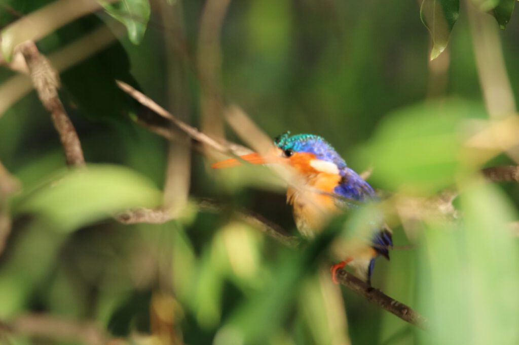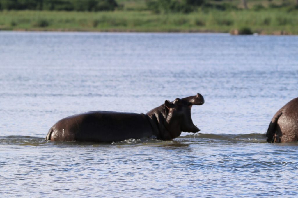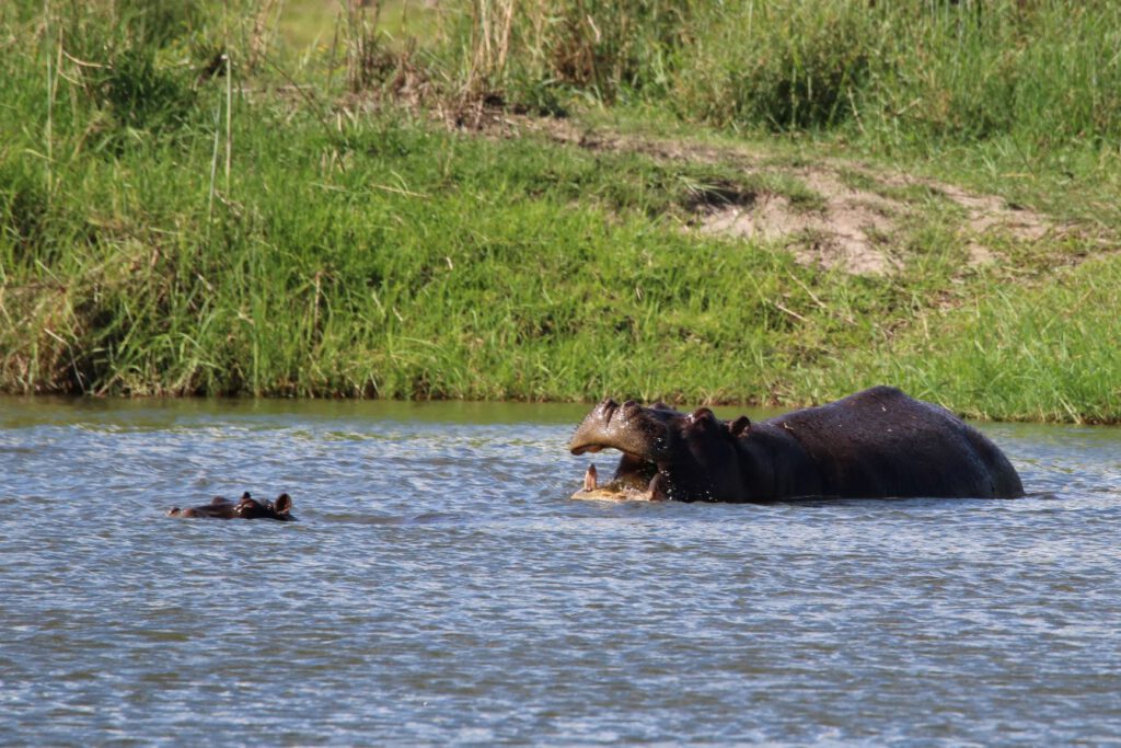 Nach genauerer Betrachtung fallen dann doch ein paar Unterschiede auf: Lianen und jede Menge verschiedene Vögel in den Bäumen, vor allem aber Flusspferde, Krokodile und Otter im Wasser. Das fehlt daheim definitiv! Die Krokodile sind zum Glück nicht zu sehen, aber eine Hippo-Mama mit Jungtier auf einer Sandbank macht mächtig Eindruck. Um uns herum zwitschert es verschiedenartig und mir gelingen ein paar tolle Schnappschüsse unterschiedlicher Vögel (Graulärmvogel, Specht, Paradiesschnäpper und weitere noch nicht identifizierte Vögel).
