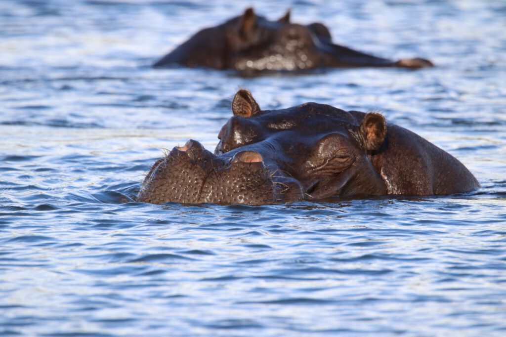 Gegen 17 Uhr starten wir erneut zu einer Bootsfahrt auf dem Kavango. Unser Guide Gilbert scheint zunächst nicht so motiviert wie Bernhard am Vortag, doch wir bekommen einiges geboten: wir fahren langsam an eine im Fluss treibende Flusspferdgruppe heran,