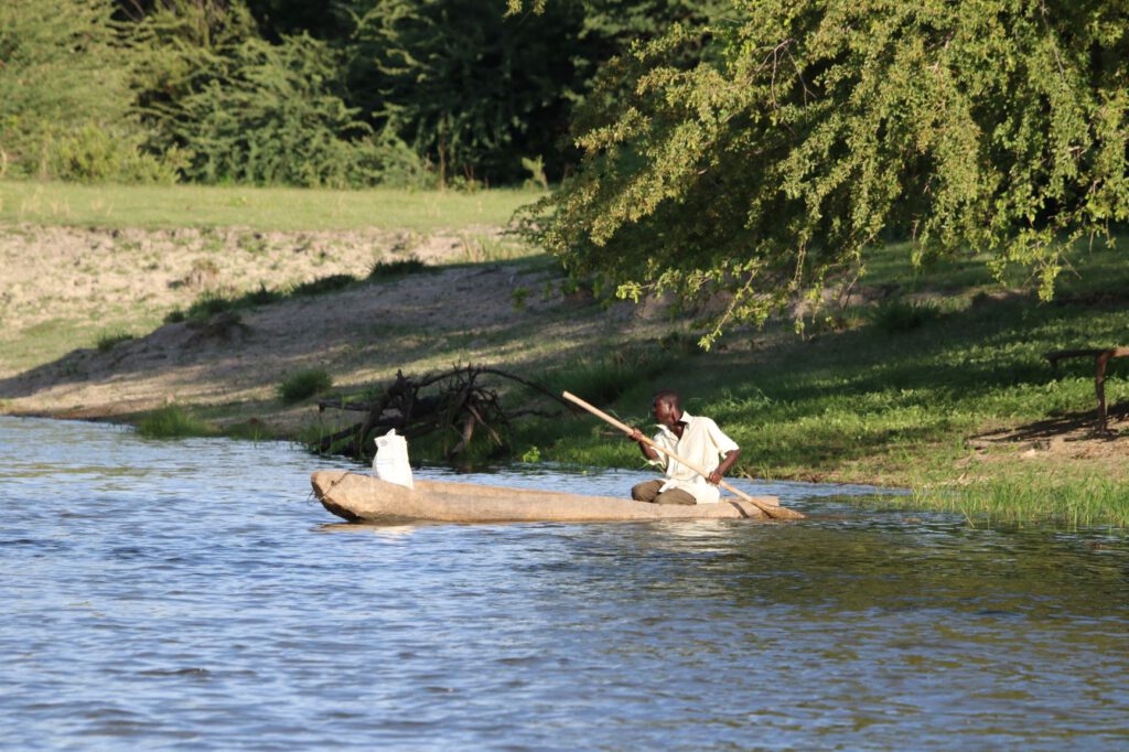 Interessant auch zu sehen, wie die einheimische Bevölkerung – seien es Namibier oder Leute aus Angola – Wäsche am Fluss wäscht, ihr Vieh tränkt, sich badet oder in den etwa 4 Meter langen Einbaum-Booten (Mokoro) von einem Land zum anderen übersetzt. Alle Leute, die wir an den Ufern sehen, scheinen Hannes zu kennen, denn sie winken ihm freudig zu und rufen ihm ein paar Worte auf Kwangali zu.