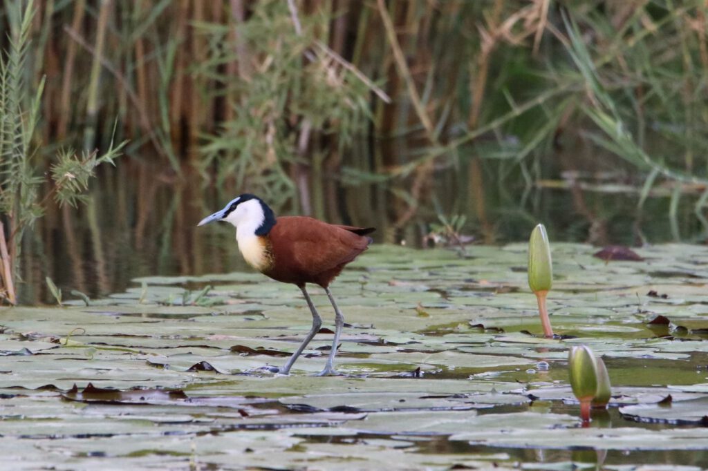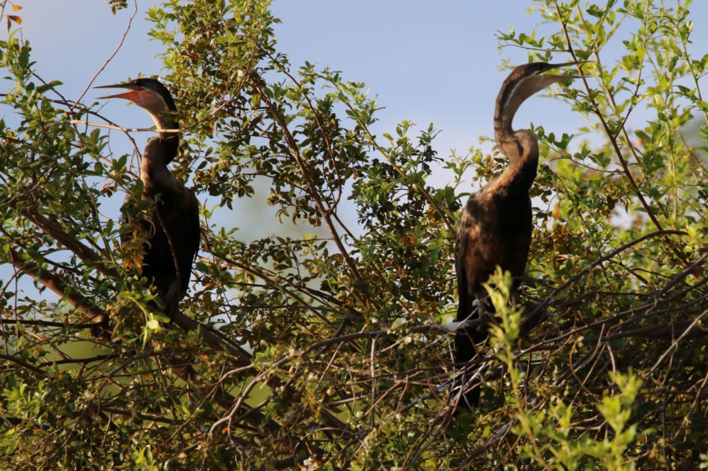 Als wir zur Bootsfahrt auf dem Kavango aufbrechen, sind Wolken aufgezogen, so wie das in den vergangenen Tagen häufig nachmittags der Fall war. Zunächst sah es sogar nach Regen aus, aber jetzt haben sich die grauen Wolken verzogen und wir starten unseren 2-stündigen Ausflug. Hannes lenkt sein Boot mal auf der namibischen Seite, mal am angolanischen Ufer entlang und wir „scannen“ das Schilf und die Büsche und Bäume nach Vögeln. Einige gute Bekannte, wie der Schlangenhalsvogel, diverse Spinte, verschiedene Reiher treffen wir an und können sie selbständig namentlich benennen. Hannes zeigt uns aber auch uns noch unbekannte Spezies. Da er die Namen meist nur auf Afrikaans kennt, habe ich dann demnächst die „Hausaufgabe“, die Vögel zu recherchieren und die entsprechenden Bilder zu beschriften.