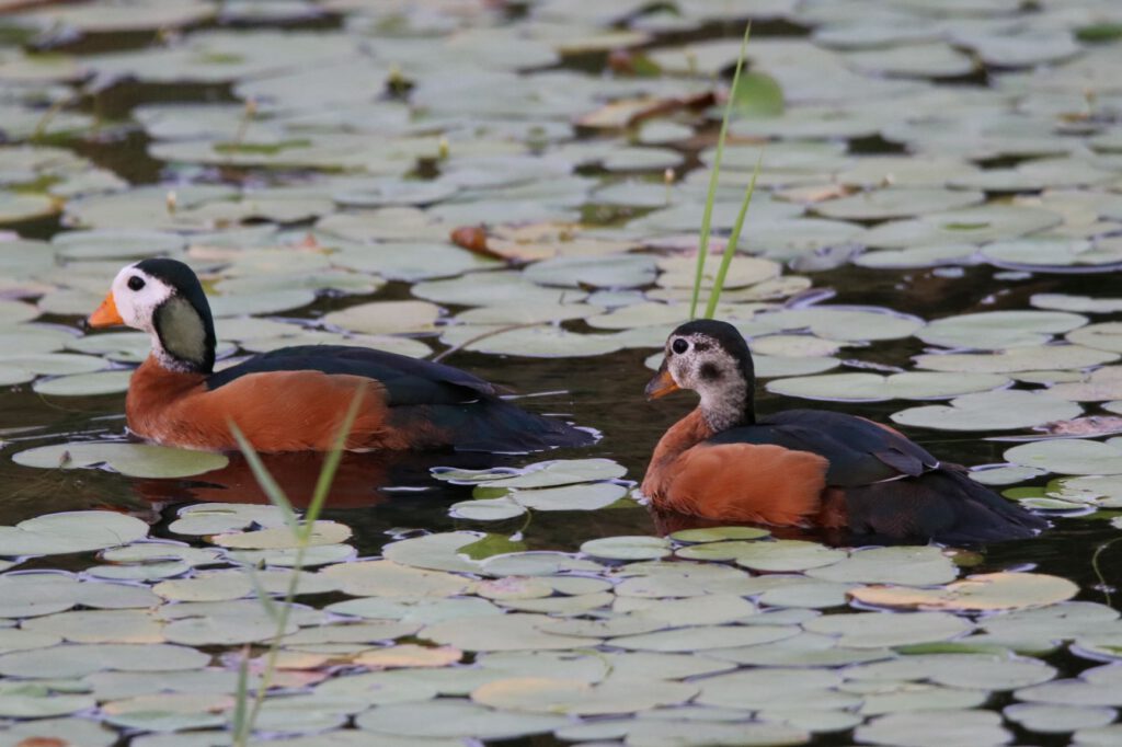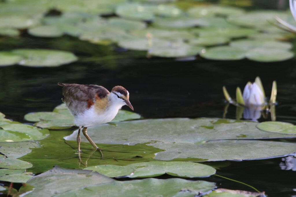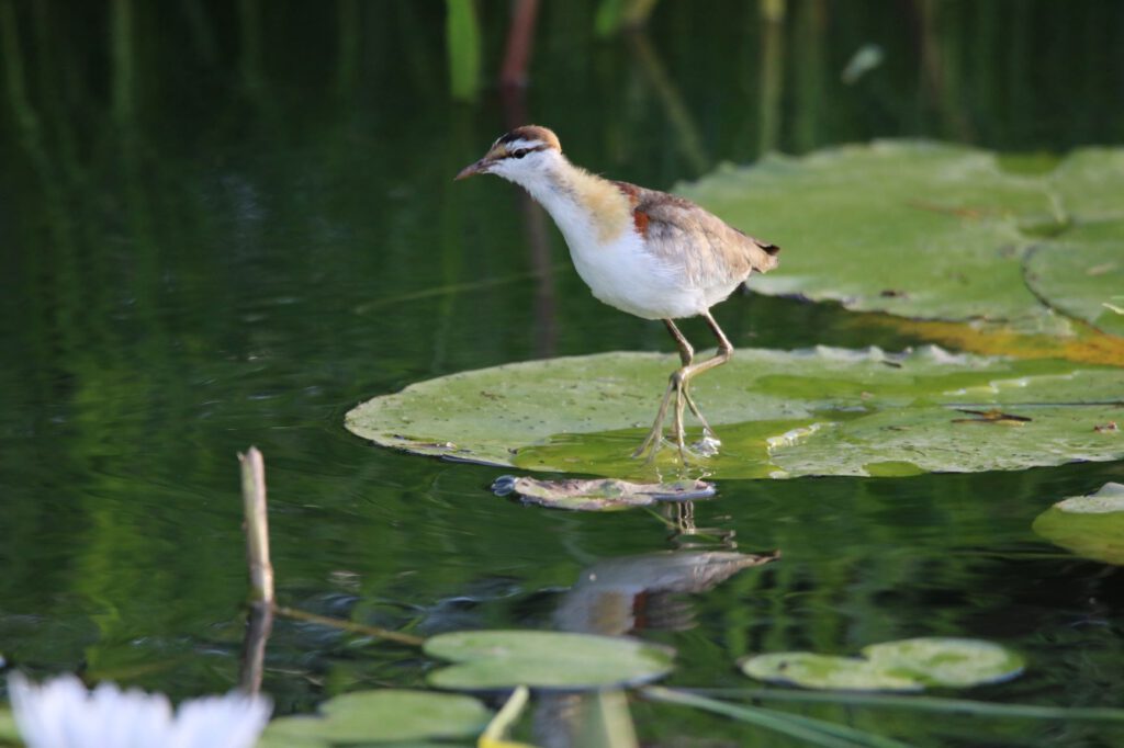 Und schon geht es weiter: wir verlassen heute das Mukolo Camp und ziehen um ins 350 km weiter westlich gelegene Mukuku Camp. Das heißt, dass wir die gleiche schnurgerade, asphaltierte B8 wieder zurückfahren, auf der wir vor vier Tagen in den Caprivi-Steifen hineingefahren sind. Da wir am heutigen Ziel nicht mehr viel unternehmen wollen, lassen wir uns beim Frühstück alle Zeit der Welt, unterhalten uns noch mit Veronica und setzen uns aufs Deck mit Blick auf den Kwando und laden die Berichte der letzten beiden Tage hoch. Es besucht uns hier der Woodland Kingfisher, der blau-weiße „Eisvogel“, der uns so gut gefällt. Er sitzt auf einem abgestorbenen, kahlen Ast und sucht im Wasser, ob sich dort etwas Fressbares findet. Wieder genießen wir die herrliche Aussicht auf das Sumpfland, wie es in der Morgensonne liegt.