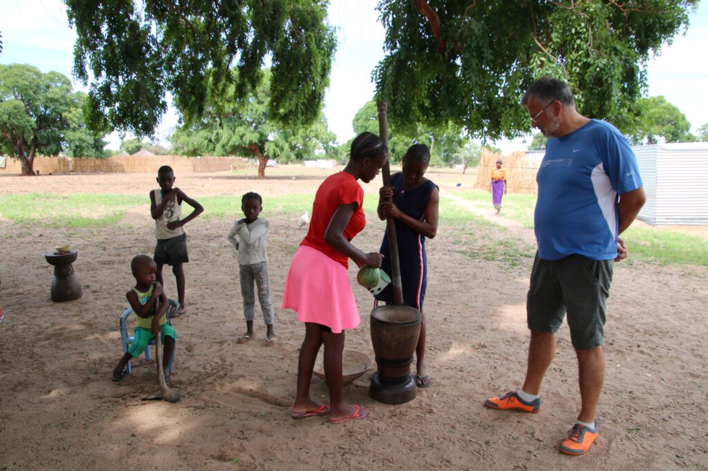 Unter einem riesigen schattenspendenden Baum außerhalb des Kraals erwartet uns schon Martha zusammen mit ein paar Kindern. Martha ist eine der Kindergärtnerinnen und spricht gut Englisch. Sie soll uns verschiedene Dinge erklären und das, was Veronica, ihre „Mutter“, sagt, übersetzen, denn diese spricht weder Afrikaans noch Englisch, sondern nur ihre Bantu-Sprache. Hannes bringt das Gespräch in Gang und wir bekommen zunächst gezeigt, von welchen Früchten und Getreidesorten sich die Familie ernährt. Zusammen mit einer anderen jungen Frau demonstriert Martha uns, wie sie aus Hirse Mehl herstellen, indem sie es in einem Holzgefäß mit einem großen Holzstück stampfen, dann sieben und danach wieder stampfen und wieder sieben.