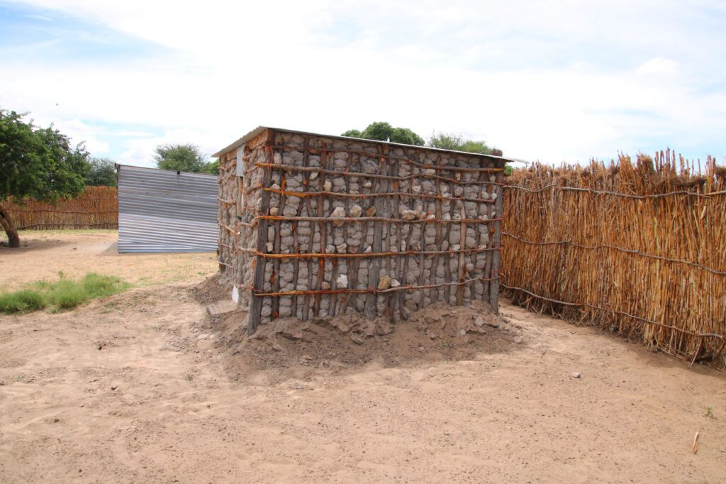 Wir bekommen die Erlaubnis, uns vom Schattenbaum außerhalb des Kraals nun auch in den Kraal hinein zu begeben. Im Kraal gibt es keine Bäume, da man ansonsten Blitzeinschläge oder herunterfallende Äste zu befürchten hätte. Martha erklärt uns die Bauweise der kleinen Hütten, in denen vor allem geschlafen, aber auch gekocht wird. Als Baumaterial verwenden sie u.a. aus Termitenhügeln herausgebrochene „Steine“.