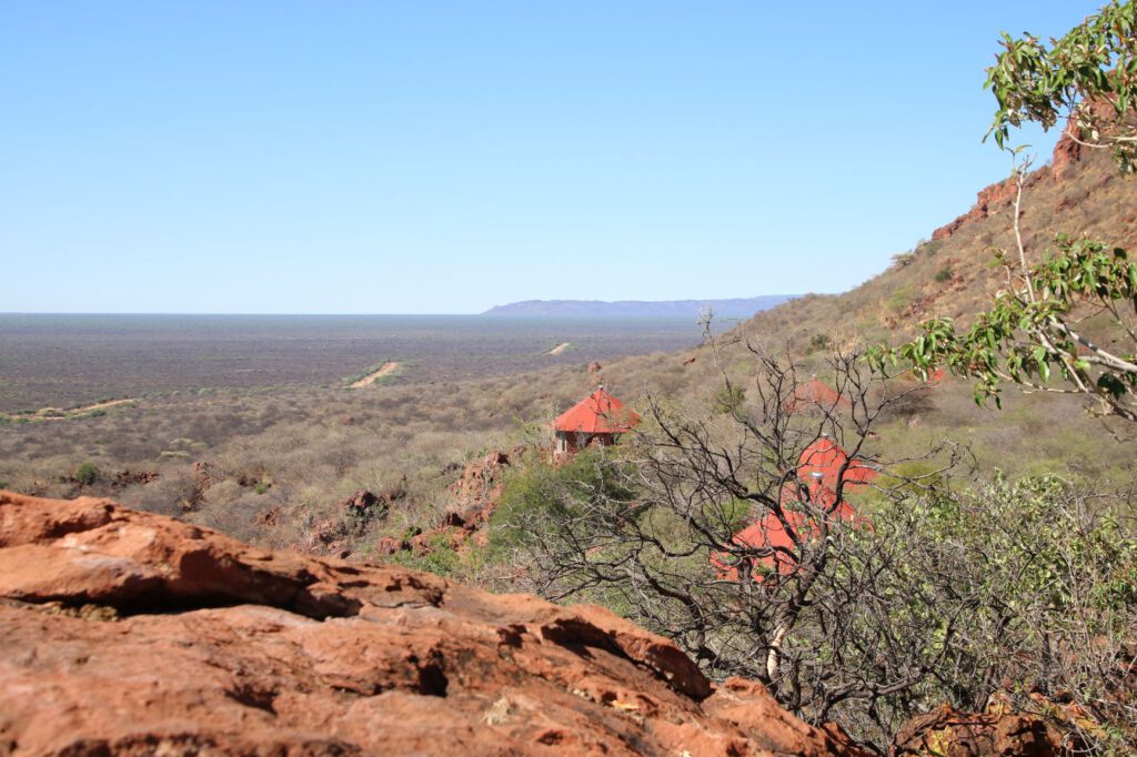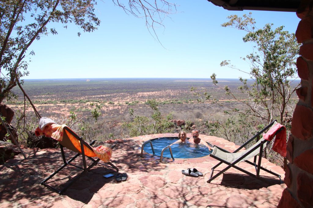 Nach einem Camping-Frühstück mit Rührei und Bacon begeben wir uns an die Rezeption und buchen auf die Valley Lodge um. Da die Valley Lodge aber geschlossen ist, weil wegen Corona zu wenig Gäste da sind, bekommen wir ein kostenloses Upgrade auf die edle Plateau Lodge. Bei der liegen die kleinen Chalets direkt oben an einer Abbruchkante des Waterberg Plateaus. Der Ausblick von hier aus ist ein Traum! So weit das Auge reicht: Baumsavanne und die typischen Farben der Kalahari. Wir sind mehr als „happy“. Vor jedem der Chalets gibt es einen kleinen Plunge-Pool. Den werden wir heute garantiert benutzen.
