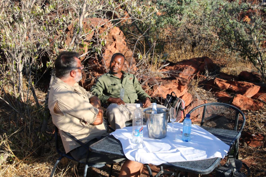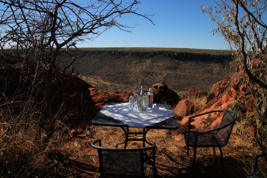 Das Licht der immer tiefer stehenden Sonne zaubert warme Farben auf die dunkelroten Felsen. Während wir die Aussicht genießen und Fotos machen, geht Frans ein Stück weiter und bereitet irgend etwas vor. Nach ein paar Minuten holt er uns ab und führt uns zu einem Tisch mit zwei Stühlen daran und mit weißer Tischdecke. Auf dem Tisch steht eine Flasche Sekt in einem Eiskübel. Der Platz für diesen speziellen Sundowner ist perfekt ausgewählt. Hier zieht sich ein Tal in den Waterberg hinein und man hat einen wunderbaren Blick auf die gegenüberliegende Seite des Tals und auf die Felswand des Plateaus. Im Tal stehen viele grüne Bäume und Büsche, denn hier gibt es eine Quelle, die permanent Wasser führt.