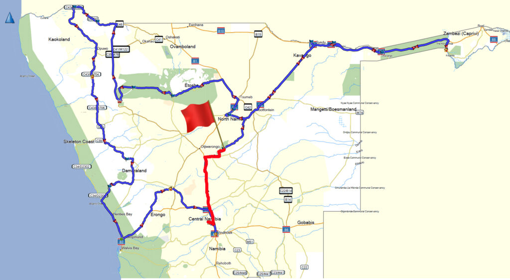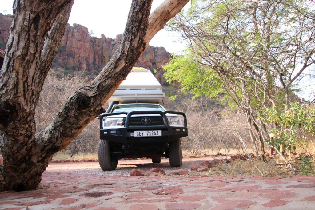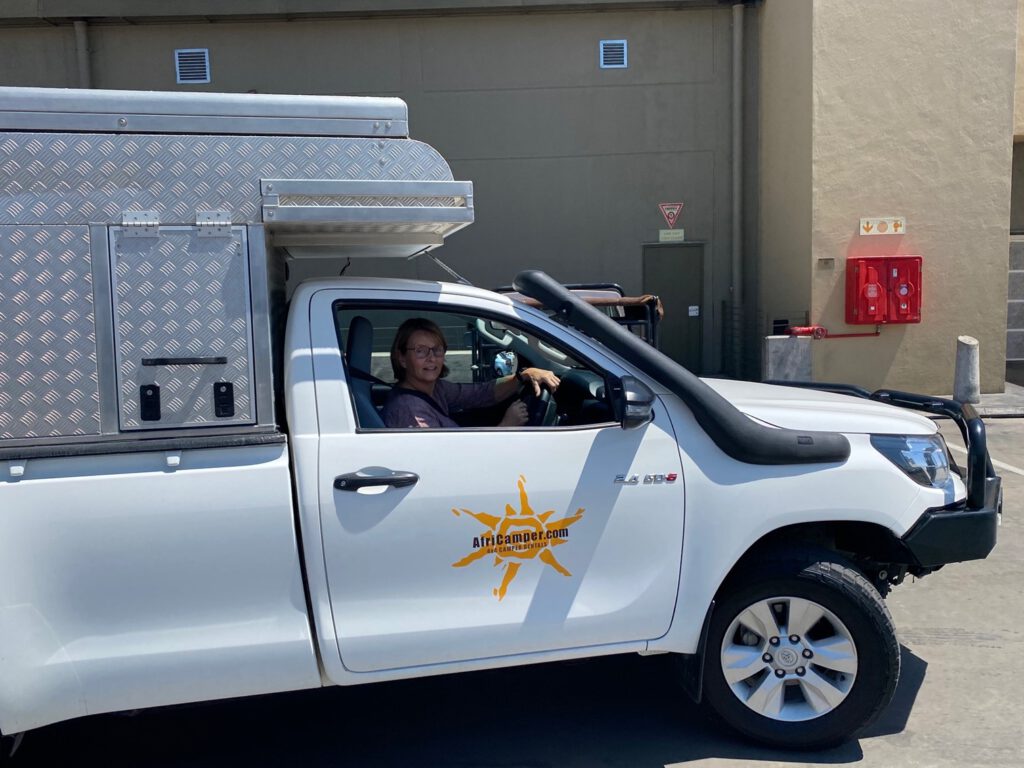 Nach einem guten Frühstück – und übrigens auch sehr gut ausgeschlafen – holt uns ein Taxi von der Arebbusch Traveler Lodge ab, um uns zu „Africamper“ zu fahren. Justin nimmt uns dort freundlich in Empfang und erklärt uns unseren Toyota Hilux. Kein Vergleich zum letzten Jahr! Ein Fahrzeug und Campingausrüstung in tadellosem Zustand werden uns unter fachkundiger Anleitung übergeben. Wir testen alles Relevante und lassen uns die wichtigsten Funktionen erklären. Nach 1 ½ Stunden verlassen wir bestens gelaunt das Depot von Africamper.