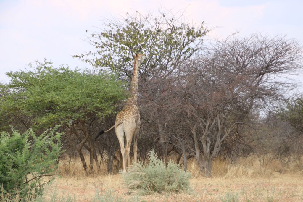 Auf den letzten Kilometern vor der Lodge sehen wir am Straßenrand einen Kronenducker und sogar drei Giraffen! “Sichtungsglück“, ohne dass wir überhaupt auf einer Sichtungsfahrt sind, so kann es weitergehen.