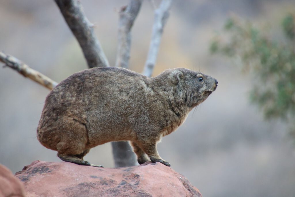 An unserem Chalet besuchen uns zahlreiche Vögel aber auch ein Dassie (Klippschliefer), der, ganz untypisch für diese Tiere, Blätter von den Bäumen frisst. Andererseits kein Wunder, denn außer einiger weniger grüner Bäume ist hier alles verdorrt.