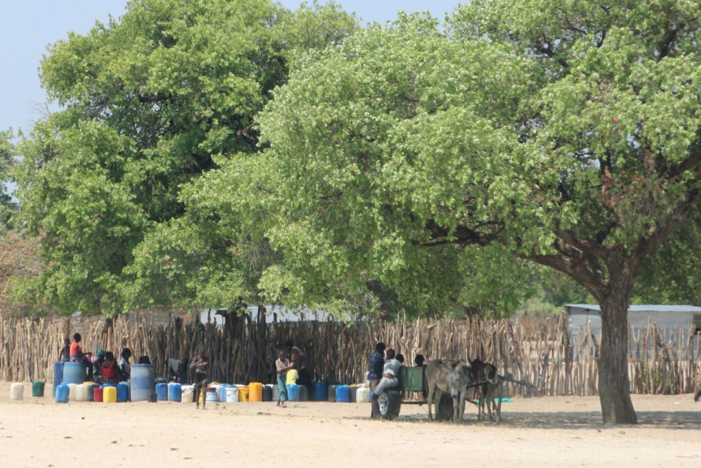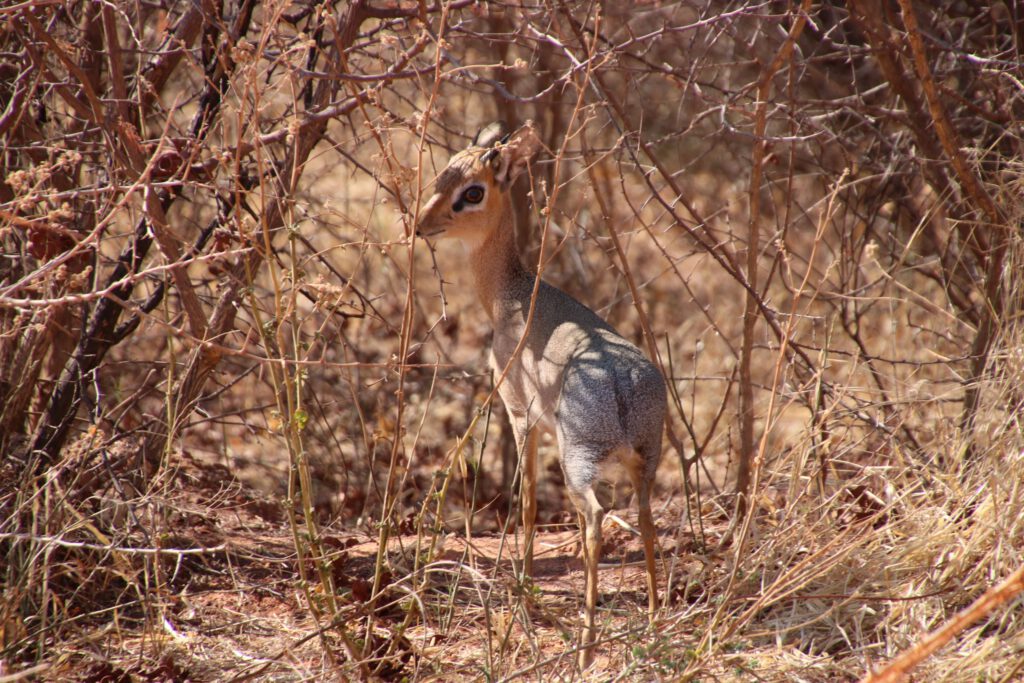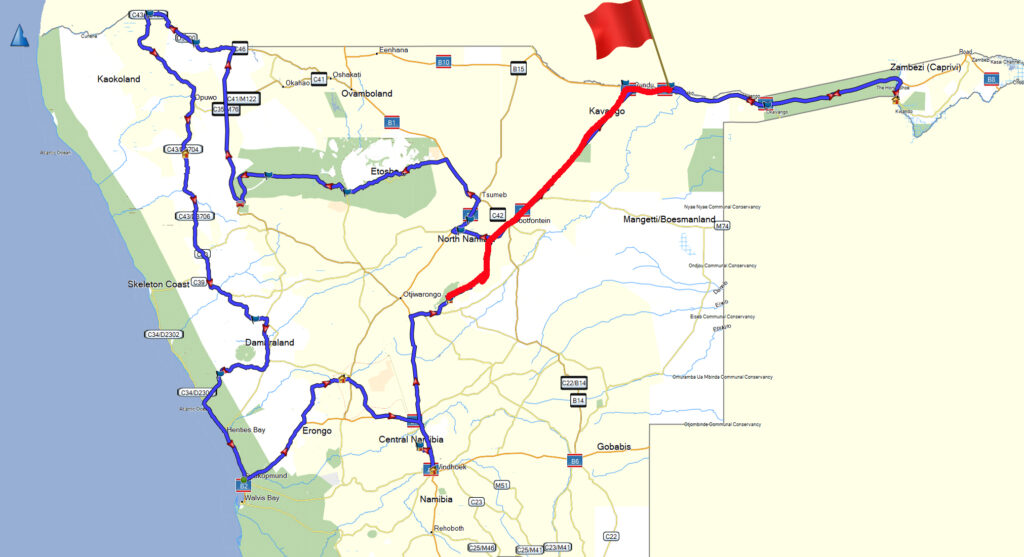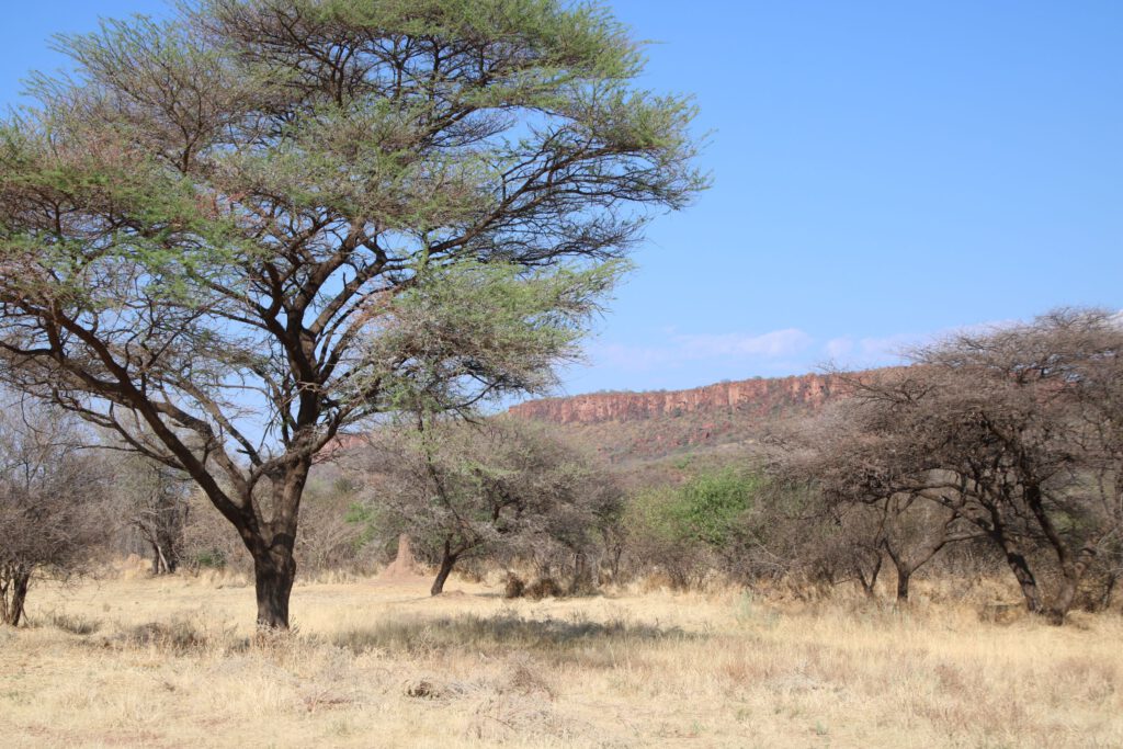 Nach dem ordentlichen – aber der Preisklasse nicht angemessenen – Frühstück in der Plateau Lodge räumen wir unseren Camper ein und machen uns um 9 Uhr auf den Weg Richtung Nordosten, zum Mukuku Rest Camp. Ca. 500 Km liegen vor uns, zunächst 100 Km auf Gravel, dann Asphalt. Die Landschaft entlang der gravelroad kommt ist uns von letztem Jahr noch in guter Erinnerung: immer wieder höhere Bäume inmitten von nierdrigem Gebüsch, halb belaubt. Plötzlich kommen mir Weihnachtslieder in den Sinn. Völlig absurd bei bereits 30 Grad Außentemperatur. Aber der Zusammenhang ist klar: auf der Fahrt vor einem Jahr in entgegengesetzter Richtung liefen im deutsch-namibischen Radiosender deutsche Weihnachtslieder.