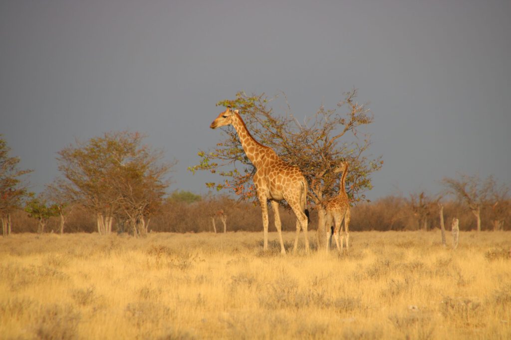 Um 6:20 Uhr heißt es aufstehen, kurzes Hygieneprogramm, Campingtisch und Stühle einräumen und los geht’s Richtung Olifantsrus, dem Camp im Westen der Etosha. Frühstücksbrote und Getränke haben wir bereits am Vorabend gerichtet. Im zarten Morgenlicht erspähen wir bald zwei Giraffen und vereinzelte Antilopen. Doch bis zum ersten Wasserloch und somit zum Frühstück liegt eine Strecke von ca. 60 km auf Schotterpiste vor uns.